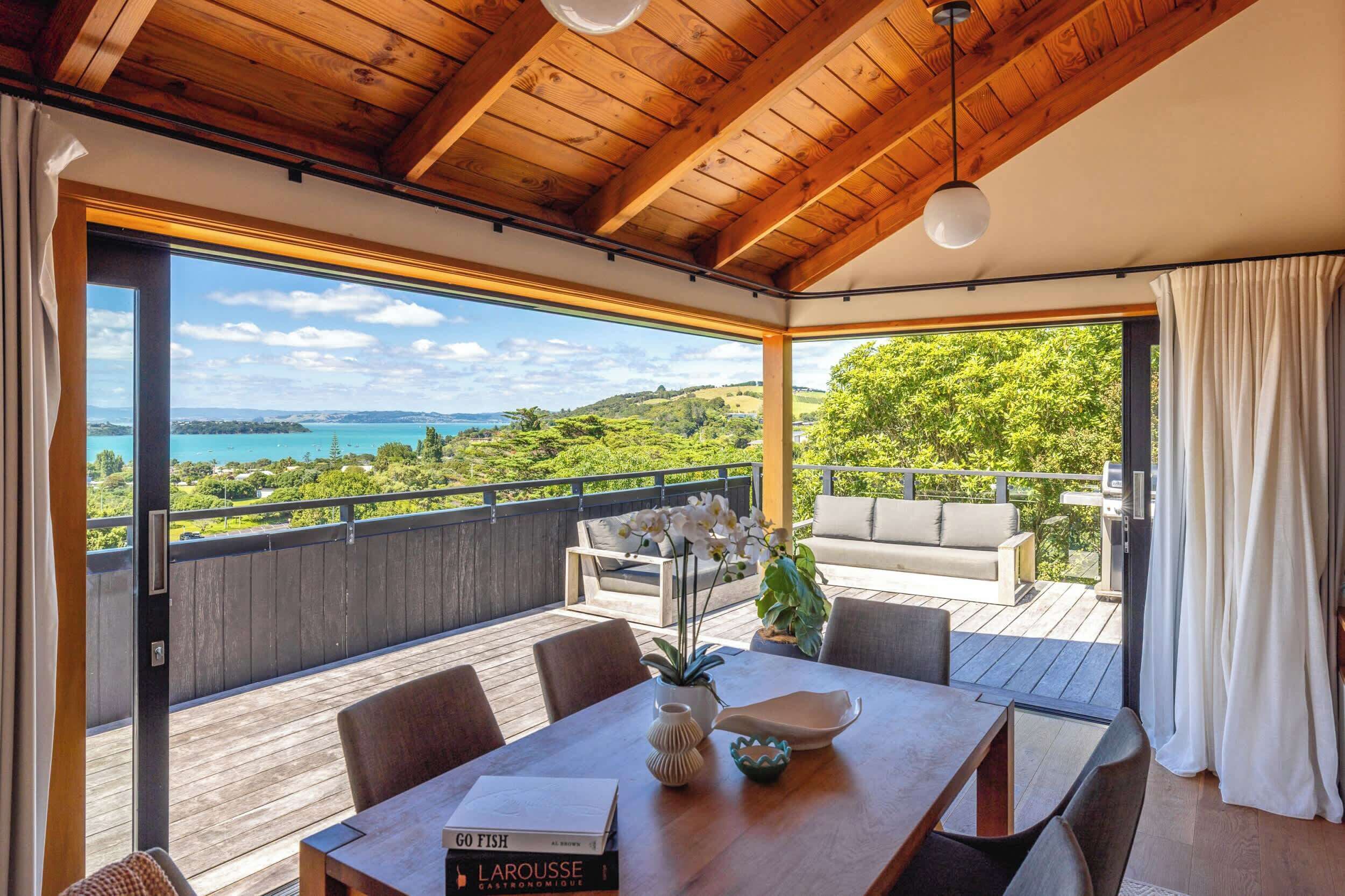 Perched above Surfdale Beach and surrounded by native bush, this peaceful island home offers stunning views, privacy, and comfort just minutes from the beach, cafes, and Oneroa village.