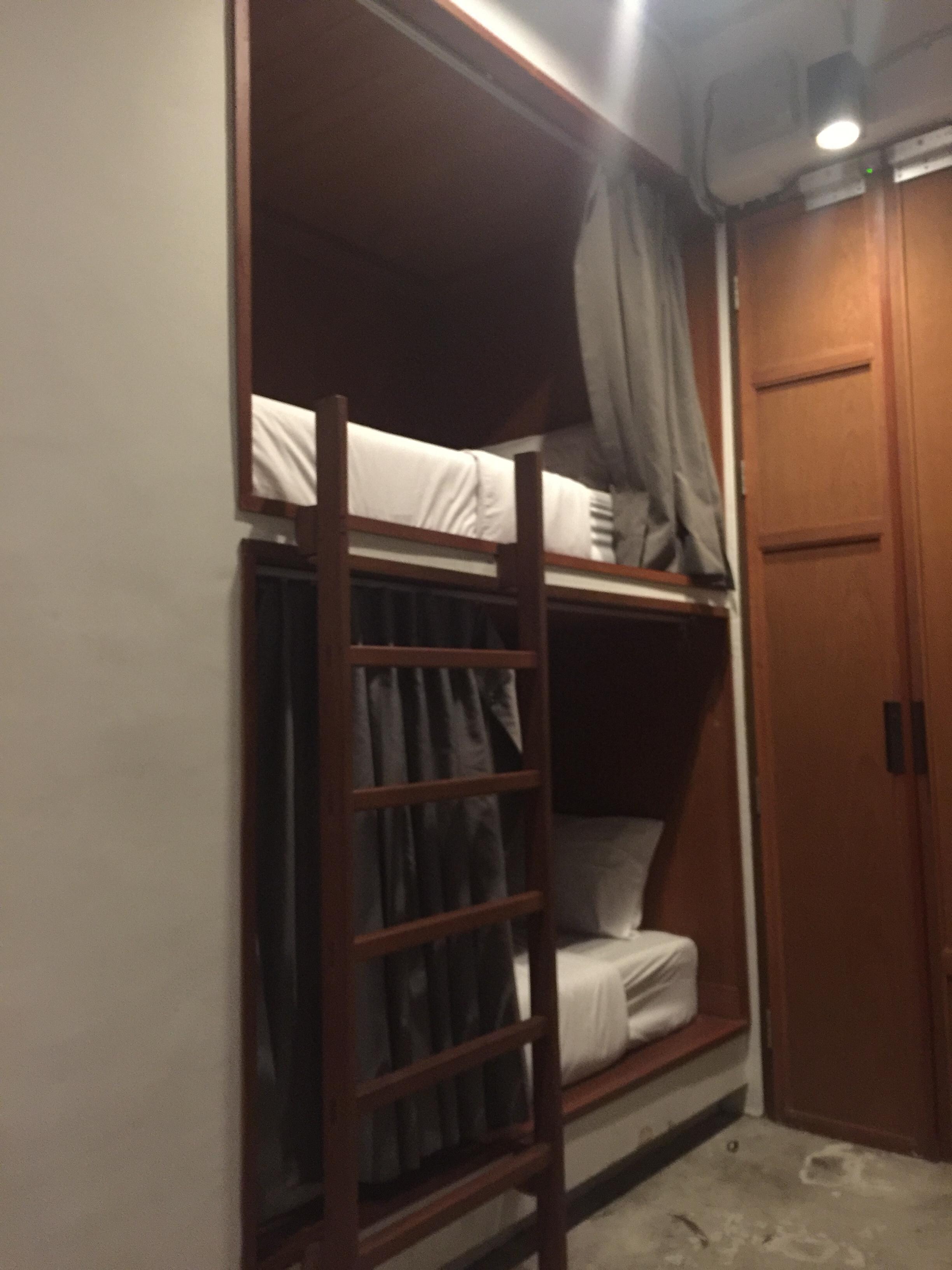 The rooms have really nice blackout curtains and mood lighting. The mattress and pillow is okay. The safe is ridiculously small and at the foot of the bed/inside the curtain so kind of awkward. So bring an extra lock for your luggage/backpack. Also, the bedroom door opens inward which is unsafe.