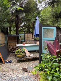 Absolutely stunning place to stay. I went away with my two children and dog and we stayed for two nights. The outdoor bath is private and inviting (we had 4!). Kids thought the outdoor loo was such a hoot that it was a family experience each and everyone hahaShelley was a lovely host and marshmallows for the outdoor fire was icing on the cake for the kids.