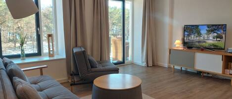Sehr schöne Ferienwohnung in Prora, dass man sein ganzes Gepäck 200m zum Haus schleppen muss, war schon eine Zumutung, auch andere Gäste machten ihrem Unmut Luft. Wenigstens zum Be.-und Entladen hätte man eine Zufahrt schaffen können. Der Platz wäre hierfür da gewesen. Aber es wird halt aktuell noch an allen Ecken und Enden gebaut.Einen freien Parkplatz zu finden war auch nicht immer einfach. Vermutlich ist dieses Problem in den nächste Wochen nicht mehr da. Die Wohnung ist sehr stilvoll, komplett und hochwertig eingerichtet, auch die Dachterasse ist traumhaft schön. Einziges Manko ist der fehlende Sonnenschirm. Weder auf dem Balkon noch auf der Dachterasse ist ein Sonnenschutz vorhanden. Wir hatten echt schönes Wetter, trotzdem war Sitzen auf dem Balkon bis gg. 15.00 Uhr in der prallen Sonne nicht möglich. Gleiches gilt für die tolle Dachterasse. Da ist bei dem Mietpreis definitiv Luft nach oben, wir haben im ganzen Haus keinen einzigen Balkon ohne Sonnenschirm gesehen. Anfragen bei Rujana ob irgendwo doch ein Sonnenschirm deponiert ist (hatten wir bei einer anderen Wohnung in Prora vor 2 Jahren schonmal, da gab es noch einen Abstellraum in einer anderen Etage) werden ignoriert, es geht niemand ans Telefon, Mails bleiben unbeantwortet..