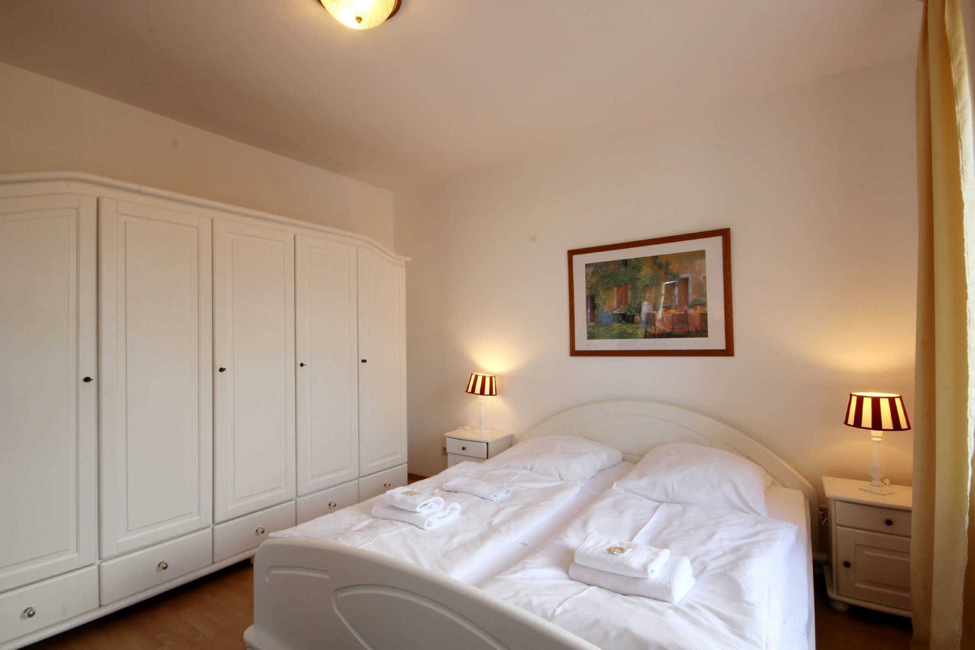 Apartment 32RB9, Villa Aesculap: Your modern 4 **** apartment 32RB9 is on the 2nd floor. The 2-room apartment has a size of approx. 63 square meters and can be occupied by 4 people. In addition to the beautifully furnished living room, there is a separate kitchen, a bedroom and a bathroom with a vanity, shower and toilet. The bedroom is furnished with a double bed and wardrobe. There is also a safe in the apartment. In the sun-drenched living area there is a comfortable seating area with a sofa bed, dining area, TV and telephone. The kitchen is fully equipped with a dishwasher, ceramic hob, oven, microwave, refrigerator and various small appliances. A parking space is available directly at the house.