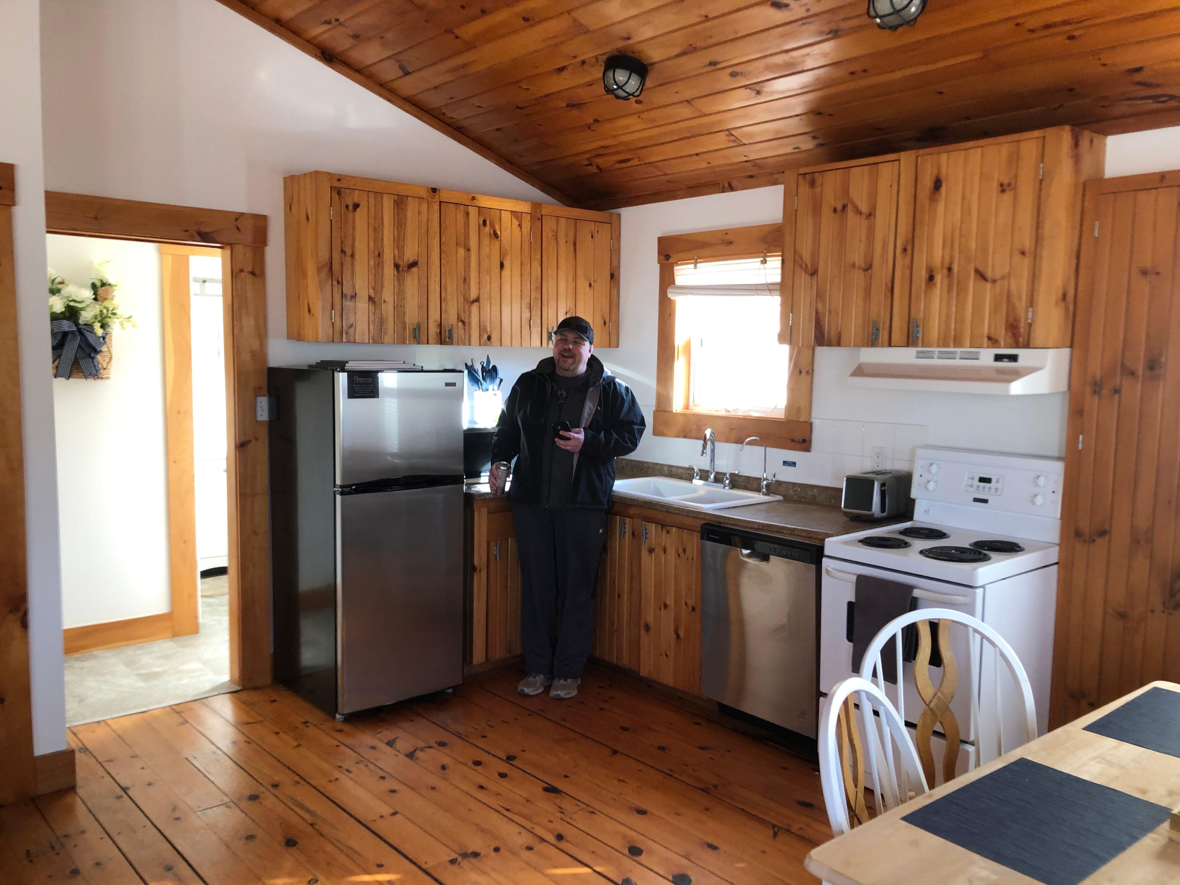 Inside, the cottage features an open-concept kitchen and living area with large windows that bring in natural light and showcase the coastal surroundings. A propane fireplace adds warmth and a cozy atmosphere throughout the year.