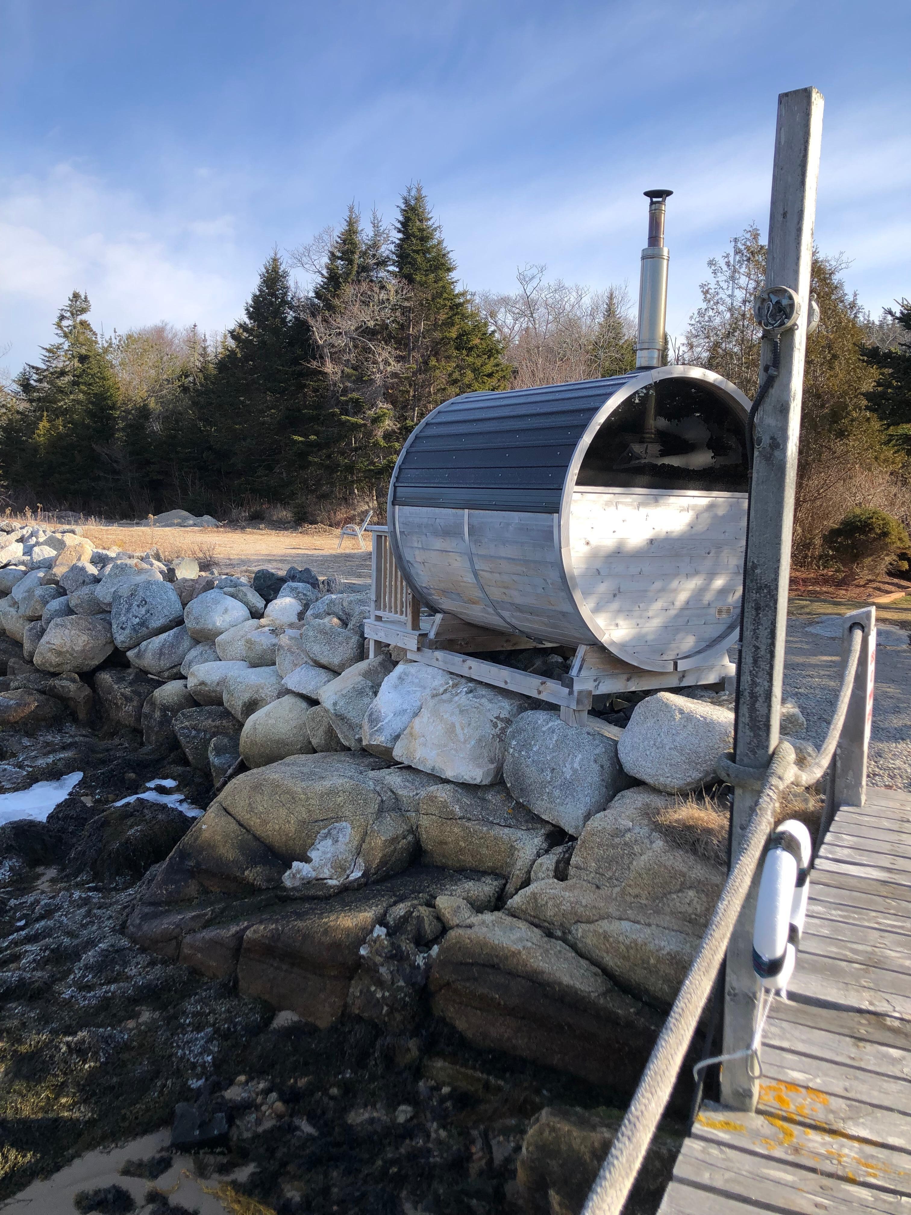 Our wood-fired oceanfront sauna is shared with other cottages and operates on a first-come, first-served basis.