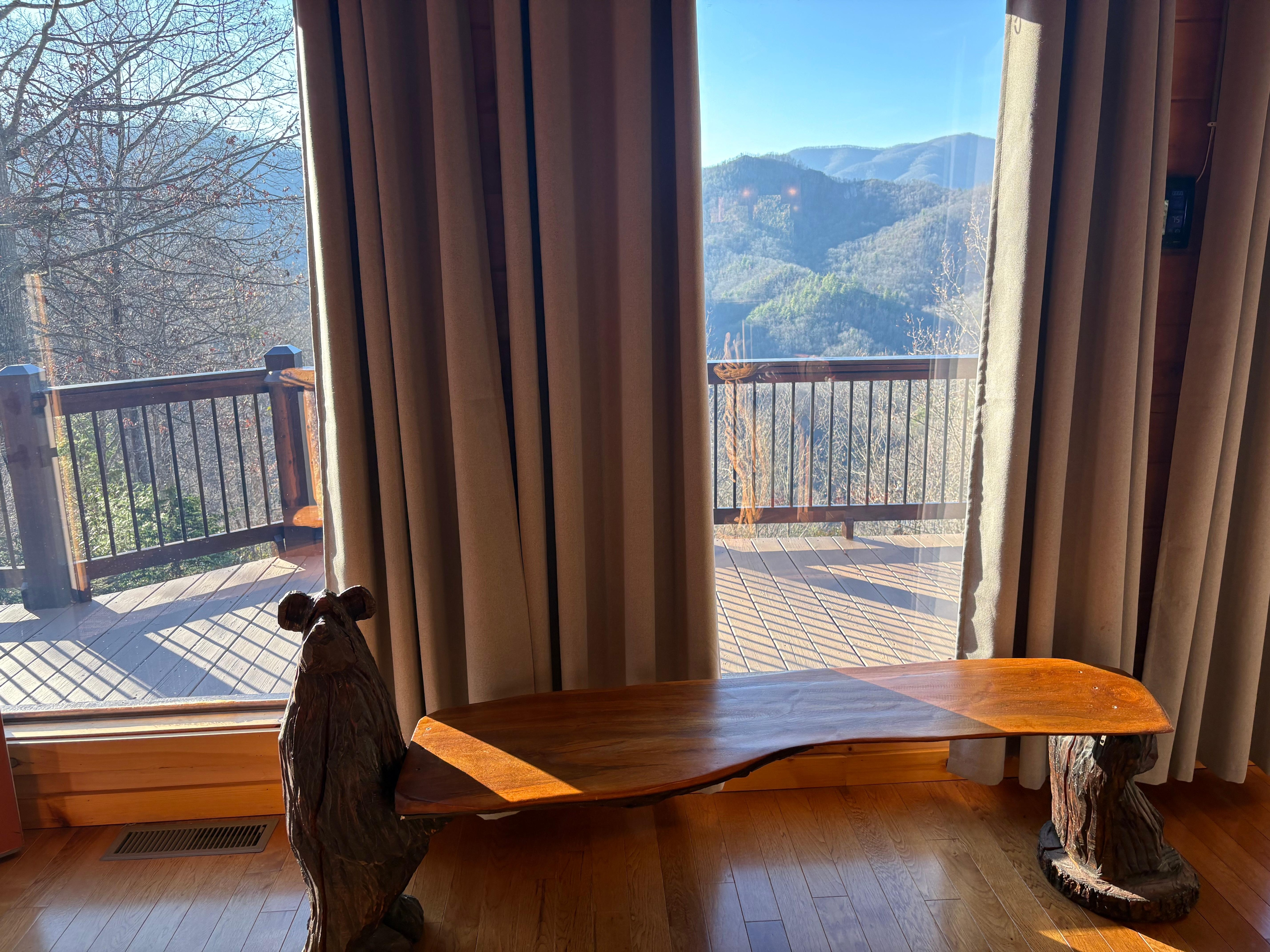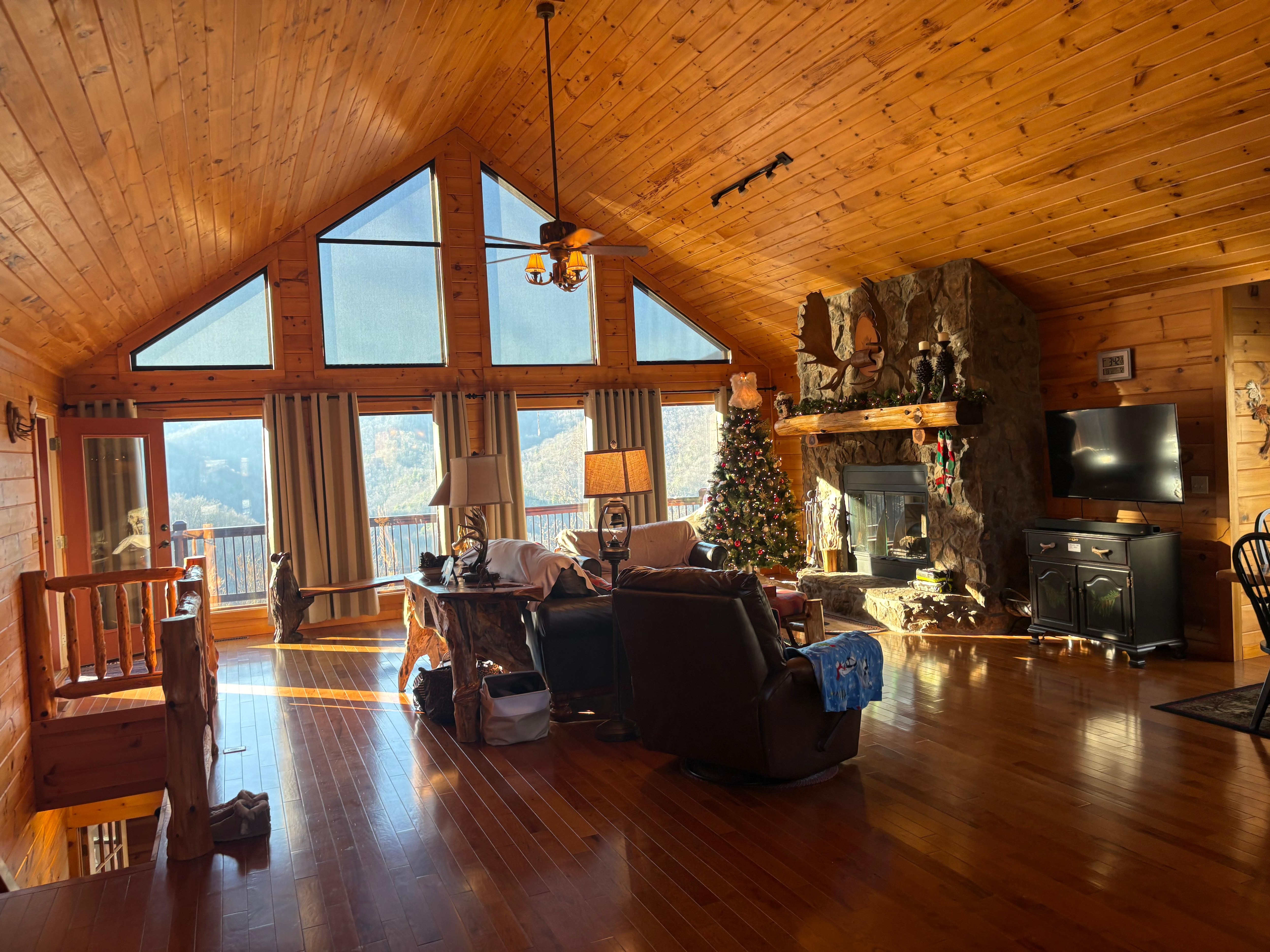 If you're interested in enjoying the great outdoors from the privacy and comfort of your luxurious log cabin, this is just the spot for you!  Simply relax in the hot tub while enjoying the stunning views, enjoy grilling out with the family and eating a nice dinner on the patio set, roast marshmallows in the custom rocked fire pit and patio, or you could enjoy the quiet serenity while sipping coffee in the porch rockers.  You can enjoy these breathtaking mountain views just as easily on the inside with the large windows that span the height of the home. Enjoy a relaxing night inside with the wood burning rock fireplace or enjoy a nice cup of coffee from your bar seating and soak in nature's beauty.