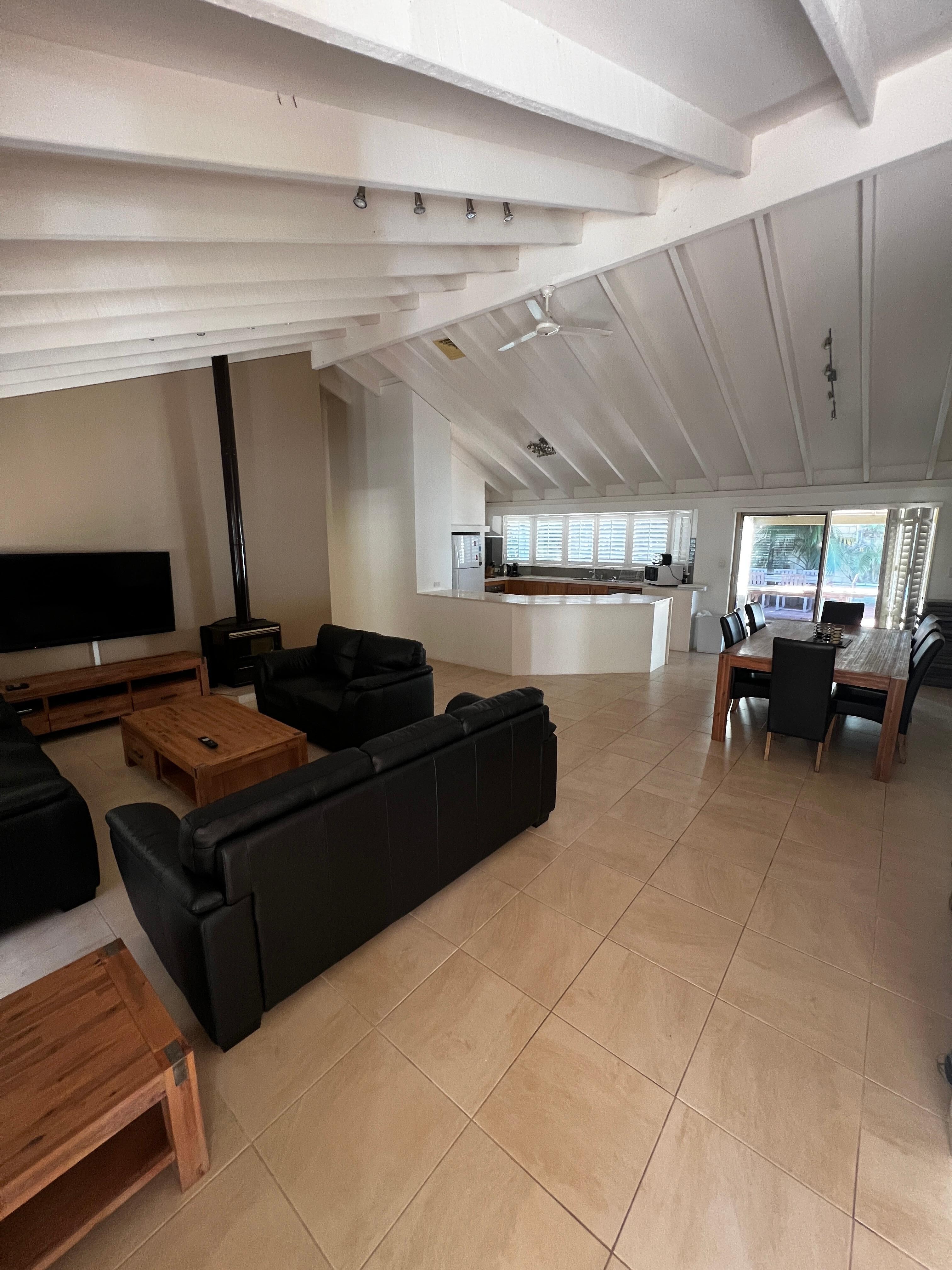 The spacious house offers a huge open plan living area with an expansive garden area (plenty of room for your boat) and undercover patio with a bbq.