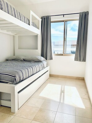 El dormitorio principal cuenta con una cama tamaño king, baño privado con una amplia ducha, balcón y un amplio armario con espacio para colgar y cajones. Los dos dormitorios de invitados cuentan con un amplio espacio de guardarropas con cajones, 2 camas individuales y el tercer dormitorio tiene una litera de tamaño matrimonial con una cama superior individual y una cama deslizable individual, lo que hace que esta habitación sea perfecta para una pareja con 2 hijos. Ambos dormitorios comparten un segundo baño bien equipado.