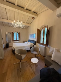 This place was fantastic! What a gem. The bed was comfy, the AC was cold, the bathroom was perfect. We shared the cottage with another couple we were traveling with. The bedroom doors open up to a shared living area, the front entrance is through the main indoor dining area.We had breakfast outside each morning. It was perfect. The staff here is just so nice and considerate, a true family affair. A flight of stairs leads down to a lovely restaurant with plentiful outside dining that shouldn't be missed. Great food with a large, affordable wine list. Would 100% recommend. Wish we had more days to linger.