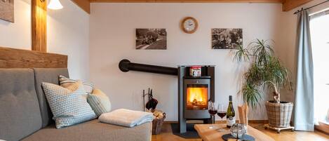 La histórica escalera de madera lo lleva directamente al majestuoso piso superior con otras cuatro habitaciones. El pasillo inundado de luz proporciona acceso directo a la hermosa y luminosa habitación / sala de estar (28 metros cuadrados) con dos sillones de lobby Lambert de alta calidad y un sofá cama exclusivo de Franz Fertig (1,80 x 2,00) y los estantes atemporales USM Haller. Además del sistema de música de alta calidad (Bluetooth capaz de conectar cualquier teléfono inteligente o tableta) con impresionantes cajas de diseño, por supuesto, también hay un reproductor de discos de alta calidad y un cambiador de CD con una extensa colección de CD, así como juegos para la familia. La chimenea en esta sala lo invita a pasar horas agradables con una copa de vino. La leña está disponible en cantidades suficientes directamente en la casa. Alternativamente, también puede disfrutar del programa de televisión del día en esta sala a través de la gran Smart TV.