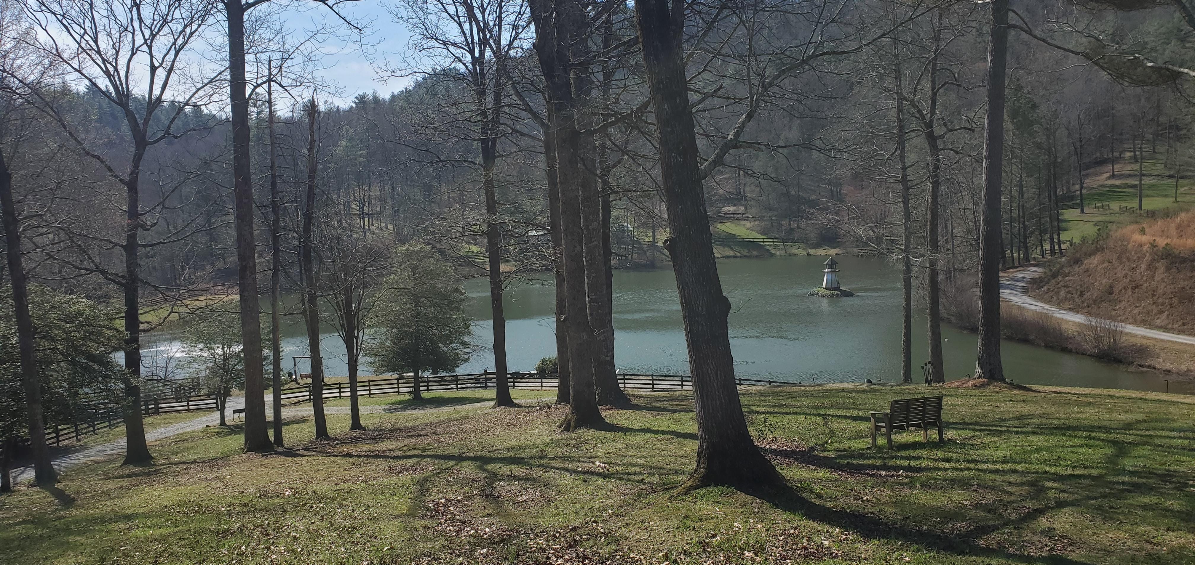 8 acre secluded lake to yourself Porch w/ a bed swing overlooking the lakeOn a raft in the lake looking at Mtn. RidgesFishing w/ no one else groundYour dog not only welcomed, but spoiledWay comfortable bedDirt road dead ends to THISYour 49th Anniversary And JesusBanner Week