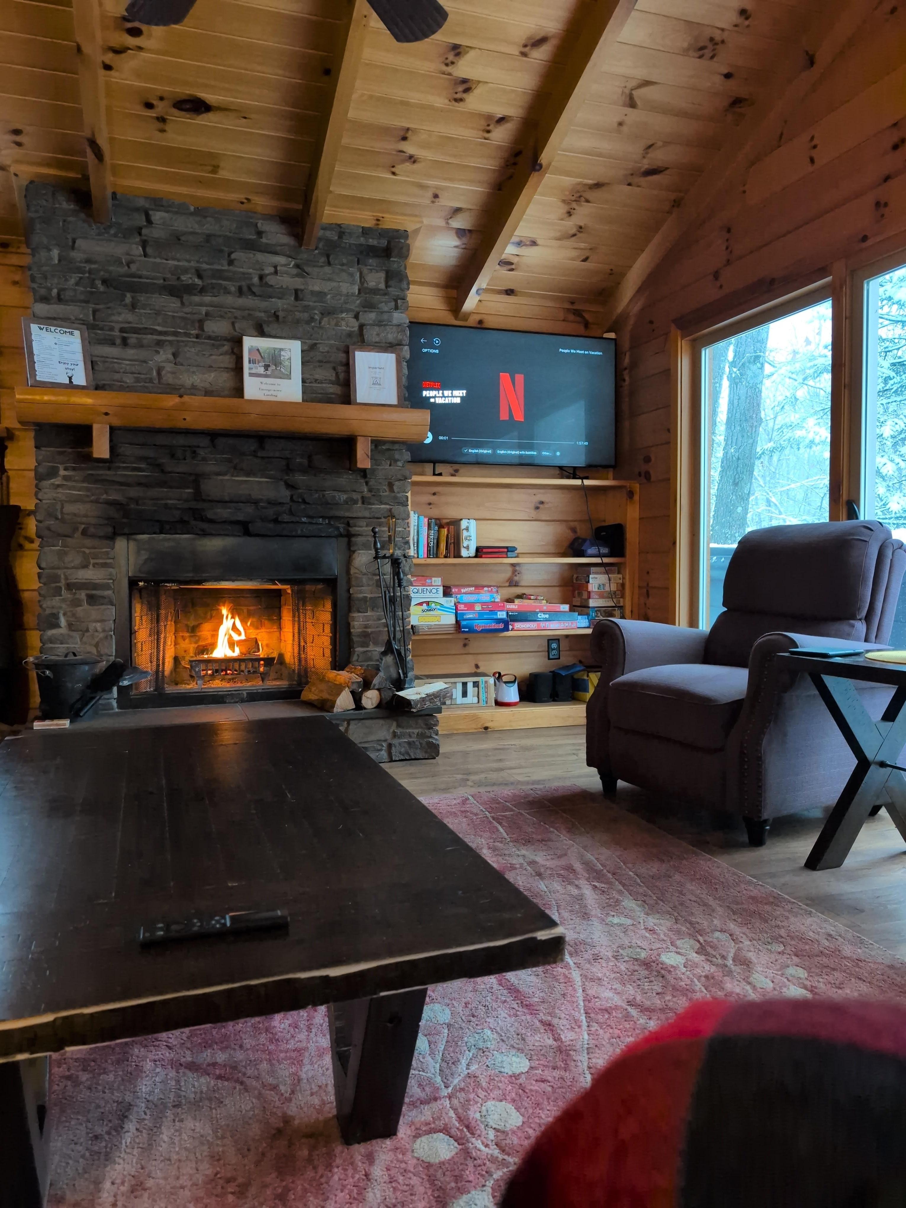 Amenities that appeal to couples at this lakeside cabin include a fireplace, a kitchen, and a smart TV.