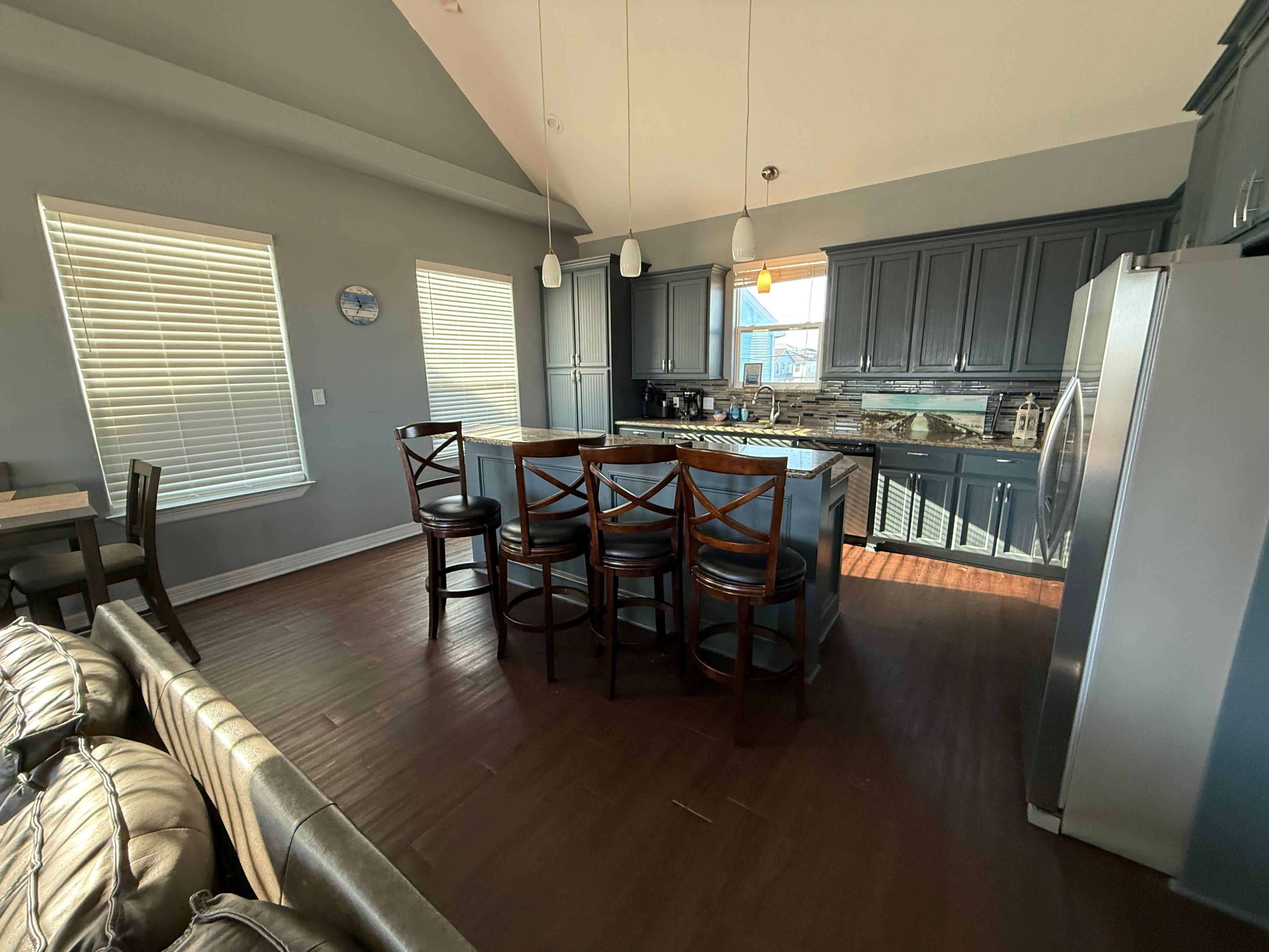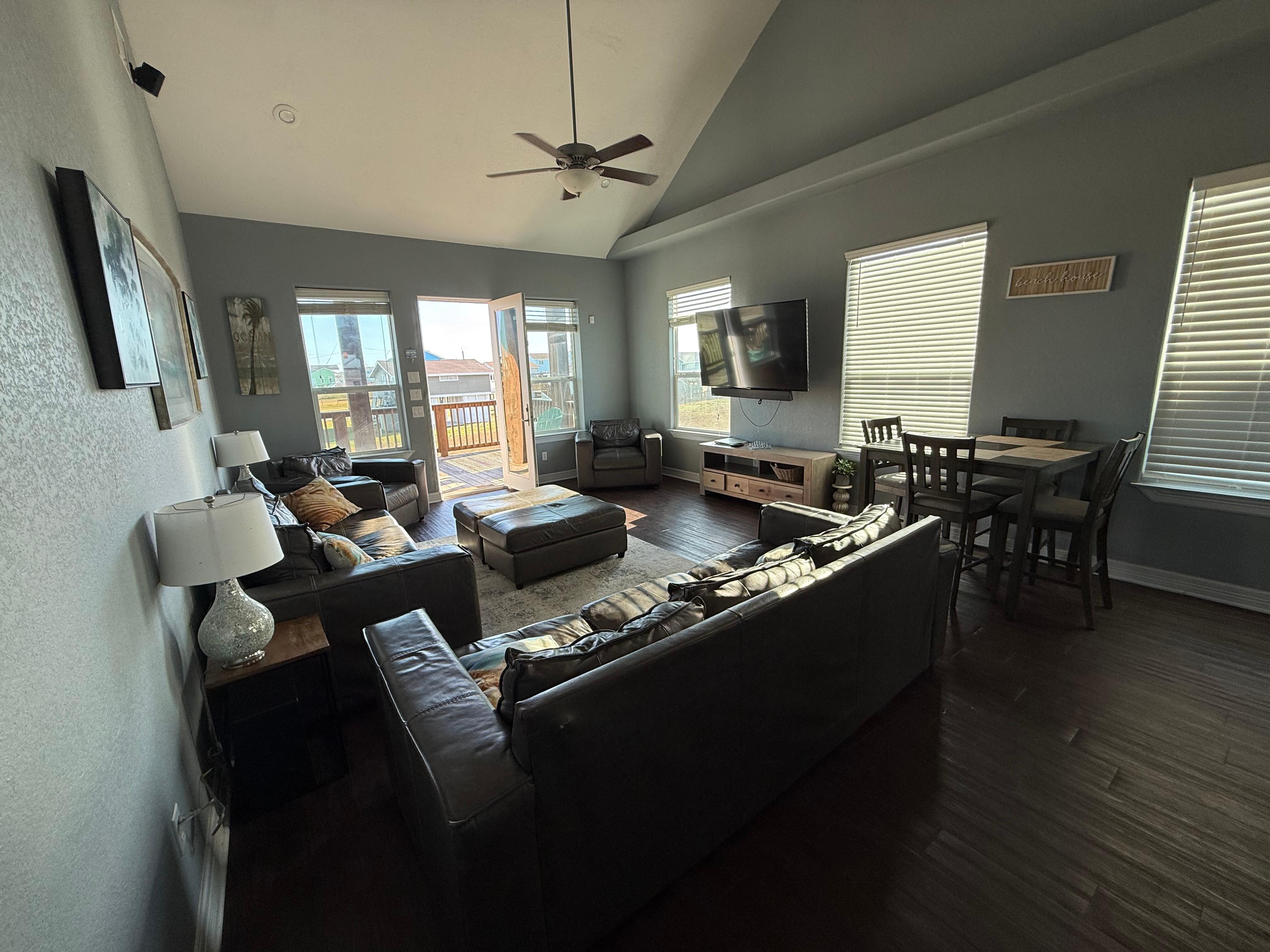 This home boasts extremely high ceilings and oversized doors. This is not your typical, everyday beach house rental. We have provided upscale decor along with beautiful finishes and amazing outdoor lighting which will make your stay feel luxurious. The Blue Marlin is a 4 bedroom/4bathroom and can hold up to 13 people. This home has ocean views and is a 2 minute walk to the beach. We also provide ample seating along with an amazing downstairs gathering area.