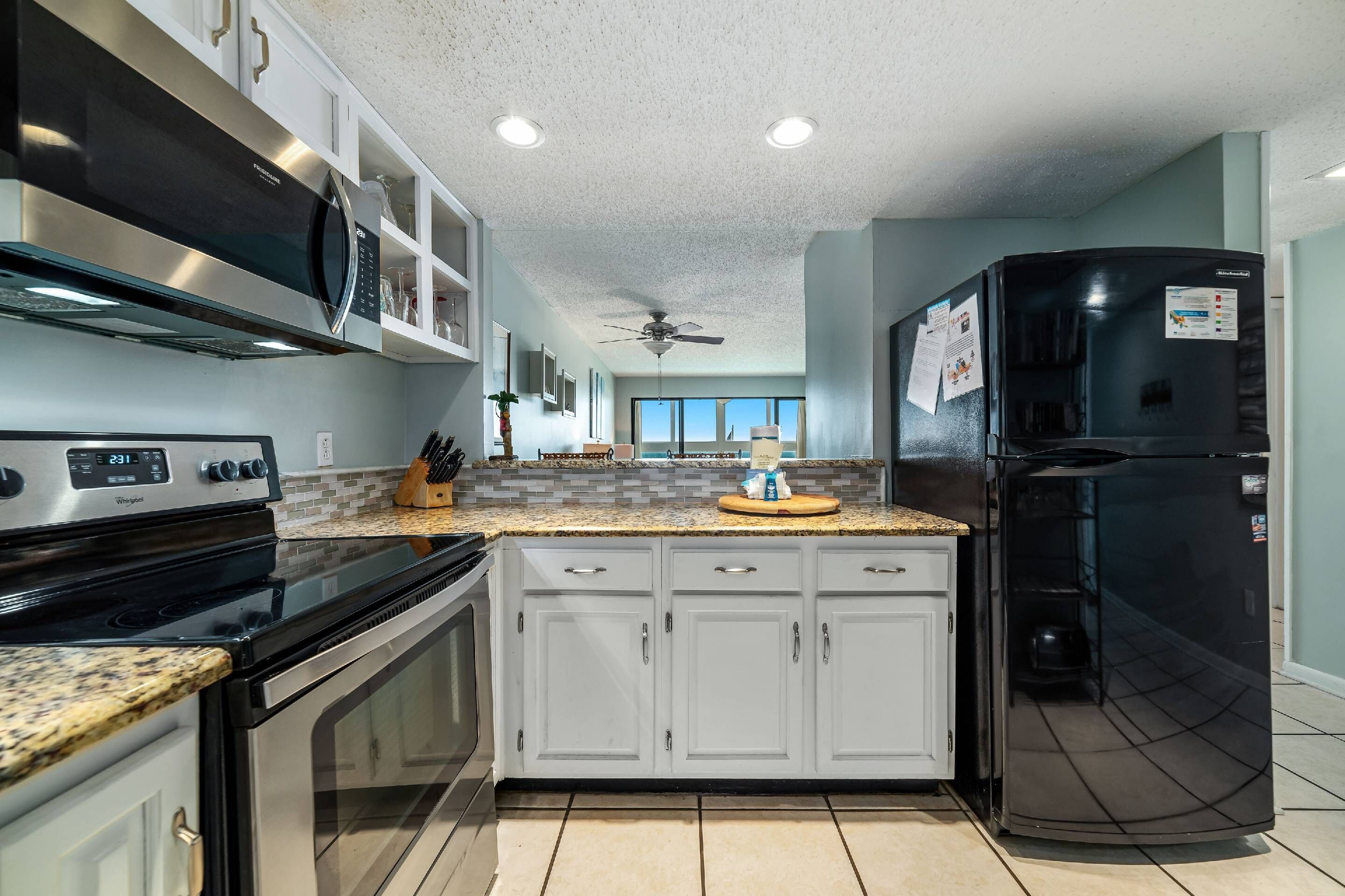 Edgewater 52 is a 2-bedroom 2-bathroom condo on the 5th floor that offers a spacious floor plan with open rooms and magnificent views of the Gulf of Mexico. Decorated in an upscale yet comfortable décor the condo offers a flat screen TV with DVD player in the living room and a queen sleeper sofa. The dining area table seats four with room for two additional diners at the breakfast counter. The kitchen is fully equipped with granite countertops and white cabinetry and appliances. The living dining kitchen and hallway floors are tiled throughout.
