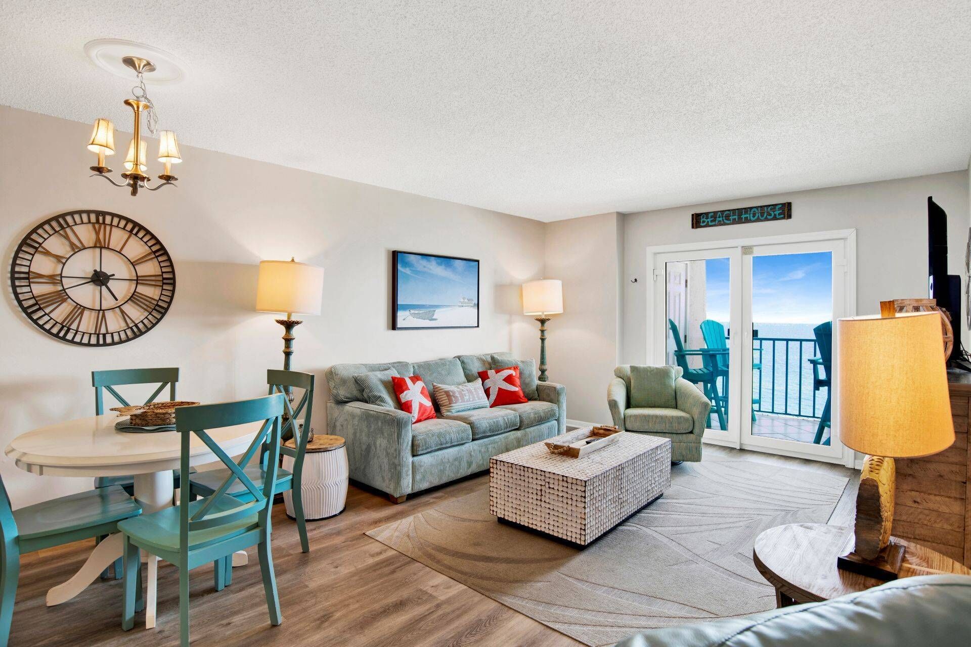The spacious open living area features cozy sofas, one of which converts to a double-sized bed for extra sleeping arrangements. Enjoy a movie on the TV or step out onto the covered balcony to take in the panoramic Gulf views or while you sip your morning coffee in the fresh air. Relax on the sun loungers while soaking in the sights and sounds of the coast. The dining area comfortably seats 4, perfect for meals together, while the fully equipped kitchen, complete with a coffee maker, toaster, and microwave, provides everything you need to prepare your favorite meals. For added convenience, a washer and dryer are included. The primary bedroom features a Queen bed, a TV, direct balcony access, and a private bathroom, making it an ideal retreat for a couple. The second bedroom offers two twin beds, a TV, and shared bathroom, perfect for the little ones.