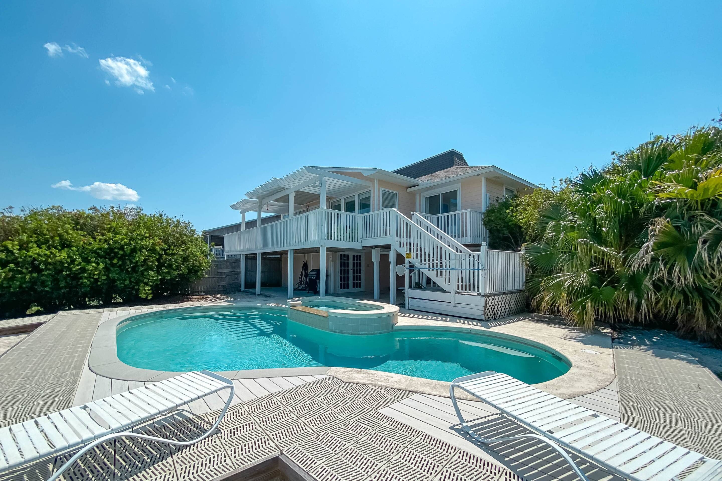 Underneath the home, guests can find a shady place to park or rinse off under the open shower after a day at the beach. There is a “park-style” charcoal grill and a picnic table for those outdoor meals. After a day at the beach or pool, enjoy the sunset and sea air on the porch swing below or on one of the home’s many balconies with plenty of outdoor seating.