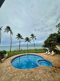 Amenities that appeal to couples at this beachfront condo include a kitchen as well as concierge services and a garden.