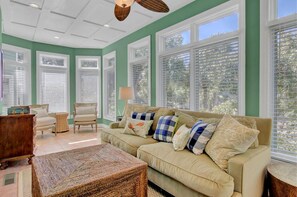 El plano de planta de 5 Grand Pavilion es verdaderamente único. El nivel inferior cuenta con un plano de planta abierto con una amplia sala de estar, comedor y cocina nueva. Una de las dos suites principales se encuentra en el primer nivel y cuenta con una cama king. Un largo porche de Charleston se extiende casi a lo largo del primer nivel, más el dormitorio principal cuenta con una terraza acristalada con vista a un hermoso patio y al camino pavimentado de la playa. El segundo nivel cuenta con el segundo dormitorio principal, también con una cama king y terraza acristalada. ¡Una habitación extra es perfecta para los niños! Se divide en dos secciones. La primera sección presenta una cama doble con la segunda sección resaltada con dos juegos de literas (cuatro gemelas). Una cama doble extra se encuentra en la terraza acristalada.
