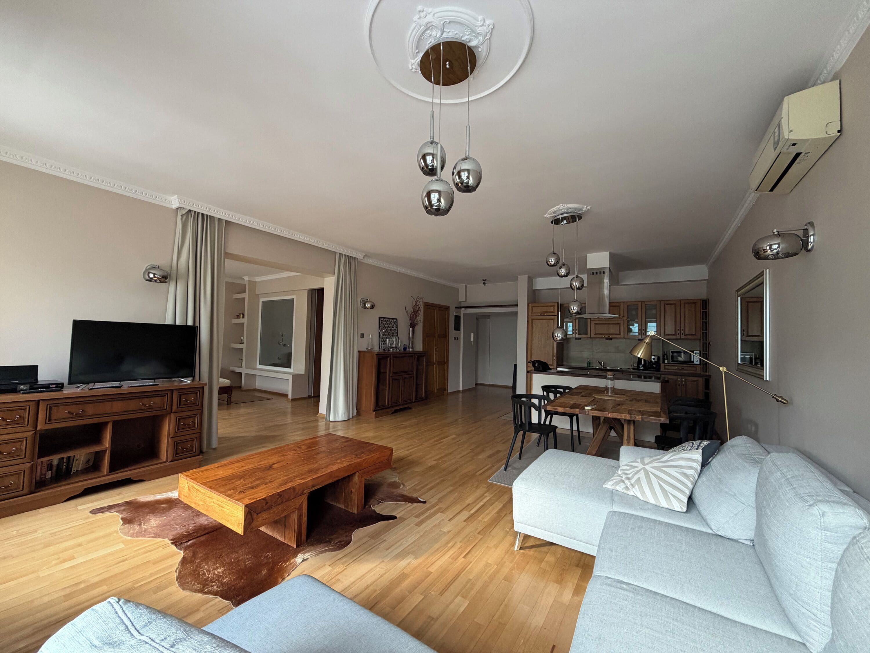 The spacious 60m2 apartment consists of a kitchen with a big dining table, a cosy bedroom and a living room with a sofa, and a seperate area with two beds (the single beds can be join together). The modern bathroom has a shower and basic toiletries. There are two huge wardrobes, one in a bedroom and one in the corridor. The apartment furnished in the cosy modern style, it has high ceilling, old wooden floor and big widows with the overview at Mikolajska Street that dates back to the 13th century.
