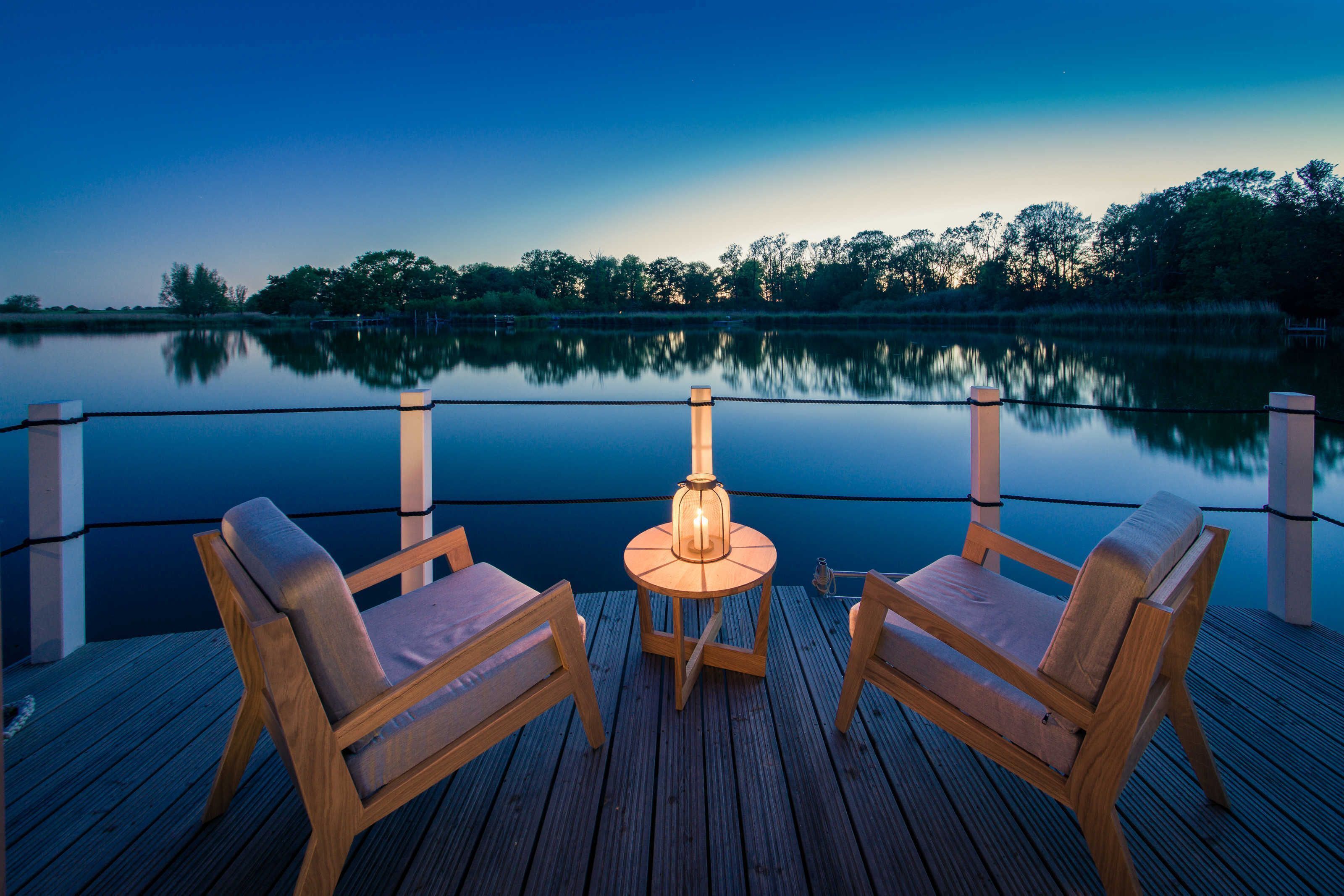 The new exclusive Schwimmenden Suites are located in the small 4-star Marina Naturhafen Krummin on the island of Usedom. The view of the water accompanies your vacation the entire time. At breakfast on the terrace, the day begins with a panoramic view of the Krummin Wiek. Romantic sunsets end the day in the natural harbor and in Krumminer harbor, the clocks are different. No hassle, no appointments, no stress: Leave the everyday life of the mainland behind in the harbor. Many details and an exclusive interior make for a feeling of well-being at first sight. In the morning, the sun smiles through the floor-to-ceiling windows and lets the day begin with plenty of sunshine. In the evening, the terrace with a panoramic view over the Krumminer Wiek invites you to a glass of wine and a view into the starry sky.   In autumn and winter, many candles and underfloor heating provide a cozy and cozy atmosphere in the room.   For exploring the area bicycles and canoes are available at the harbor. With an optional sailing trip from the natural harbor, discover the maritime side of Usomoms with a skipper.   In Krummin itself you can expect idyllic garden cafes.