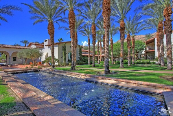 ¡Bienvenido al paraiso! Pasea por DOS patios privados con vista a hermosos jardines y vistas a la montaña en esta villa de estilo hacienda española entre fuentes en cascada y 12 piscinas espectaculares. En el interior, puede esperar citas lujosas que incluyen bañeras de hidromasaje, pisos de baldosas españolas, televisores de pantalla plana y chimeneas.