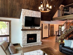 Spacious family room with gas fireplace & 65” Roku TV Fully stocked modern kitchen with new appliances Dining area with seating for large groups
