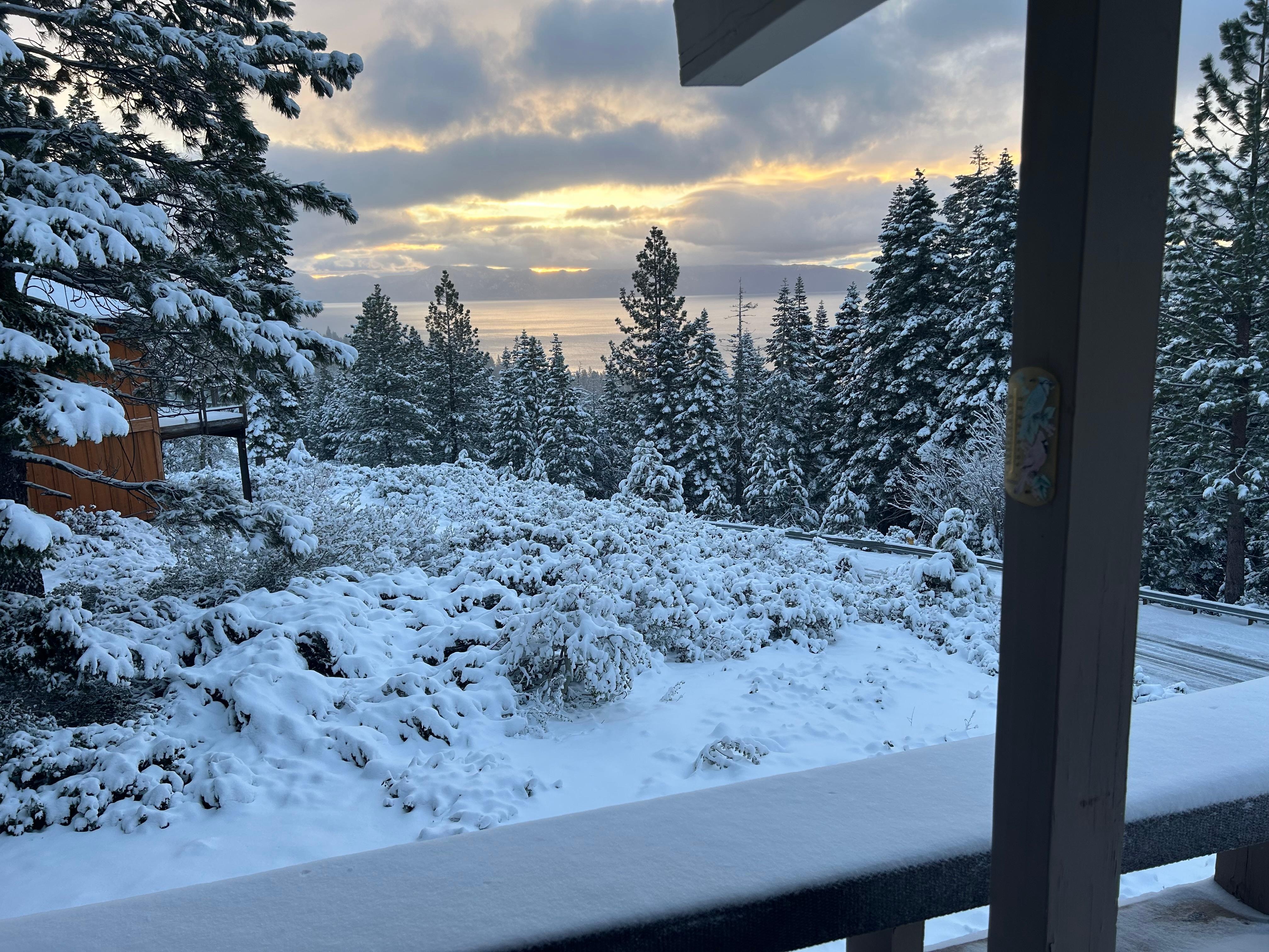 Our home is nearly 3,000 square feet and features two fireplaces, one woodburning and the other with a remote control gas log. There is a private patio in the front with a large stainless steel gas BBQ ( the BBQ is available when snow is not present)and new firepit, and in the back, a huge, wrap-around deck with panoramic views facing Lake Tahoe. Paneled in first- cut redwood, the house has an extensive collection of board games for guest use, as well as beach chairs, inflatable raft and umbrella, rolling cooler and beach wagon ad assorted beach toys. Hundreds of books, from recent bestsellers to hiking and fishing guides to the area are available for guest use. The huge, living room flat screen TV now features smart capabilities - you may order any form of entertainment you enjoy and view it instantaneously. The new flat screen in the rear king bedroom also features Apple TV.
