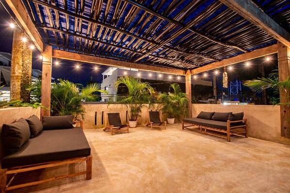 The space Enter through a tropical garden with palm trees, climbing plants, and hand-picked vibrant floral arrangments that display a tranquil environment setting the tone for an unforgettable stay @Casa Bonita. All Bedrooms at this Villa have large spaces, private full-size bathrooms, his and her sinks, and quality bathroom fixtures providing multiple showering options after a long day in the sun. All Villa bedrooms are located on the second and third levels. The open aired ground-floor common room has an oversized feeling from large floor-to-ceiling spaces with many unique and comfortable places to kick up your feet, sit, read, cook or simply rest. At night, let the multi-colored ambient lighting create a space to reflect a great mood. Play games at the oversized sit-down table and plan a dip in the heated pool after dinner. If you are lucky enough, allow mother nature to amaze you with a periodic tropical rain shower dropping indoors on the large leaf plantings and in the pool. A great space perfect for sharing remarkable moments together. In the kitchen, you are free to comfortably cook on the open-concept floating kitchen island equipped with all the necessary amenities for that special meal.