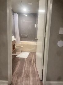 Clean, renovated large room. Great bed too. The staff was great the lobby is beautiful. The grounds are well kept and patrolled for safety. The resort is older but so am I , and it has some shine left in it, The bathroom surrounds and fixtures have been updated. So has the flooring. The place was pencil and close to the Thomas and Mack. We will stay here again.