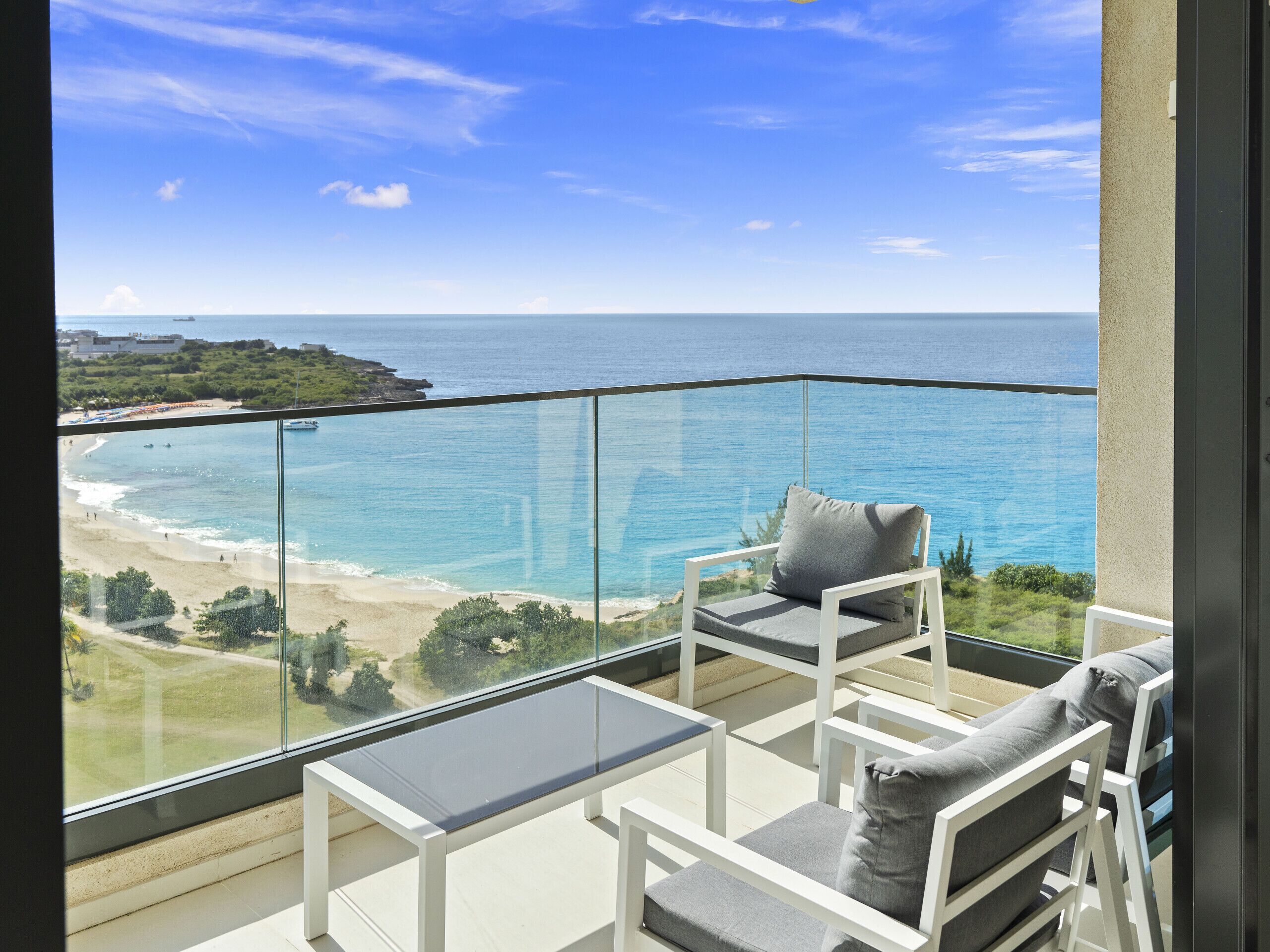 Welcome to a beautifully curated one-bedroom apartment, located on the 7th floor of a prestigious building, offering breathtaking panoramic views of the turquoise waters of Mullet Bay.