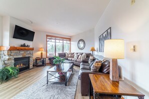 Step inside to a bright, modern, and thoughtfully refreshed living space crafted for both comfort and style. Large windows flood the room with natural light, while the inviting fireplace and flat-screen TV set the scene for cozy evenings after a day on the mountain. The remodeled kitchen shines with an island, upgraded finishes, and a full-size dining table—making it the perfect gathering spot. Fully stocked with all the essentials, it’s ready for home-cooked meals, après-ski snacks, and everything in between.