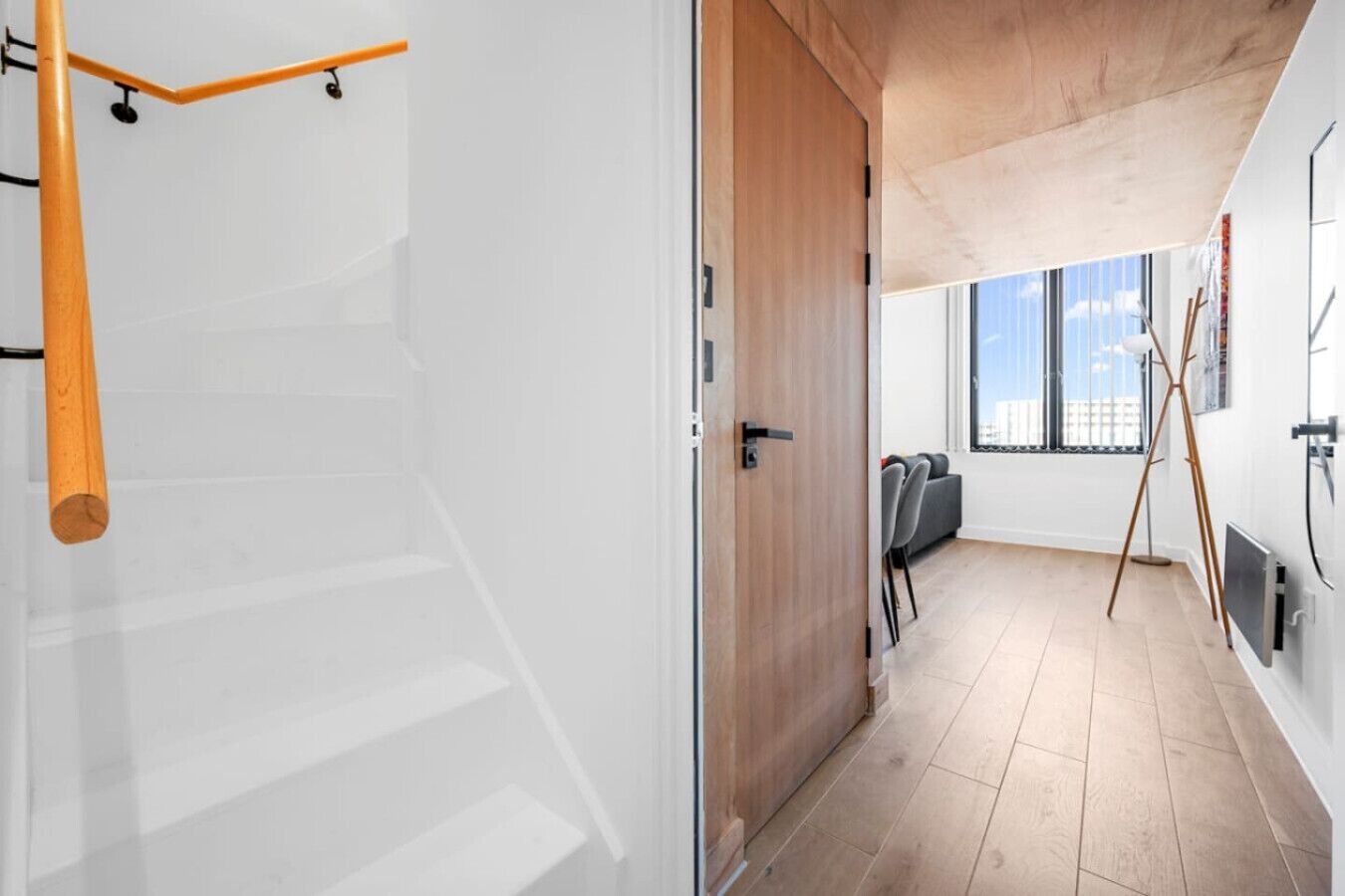 This is a split level apartment