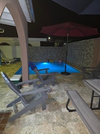 There are many amenities for couples at this vacation home, including a private pool and access to a chef as well as an outdoor pool.