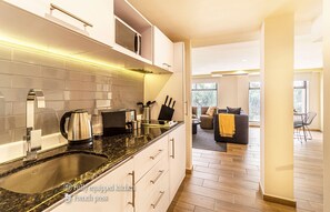 The apartment is air-conditioned and features a kitchen and space to spread out with a separate bedroom. Other standard amenities include a washing machine, a sofa bed, and a coffee maker.