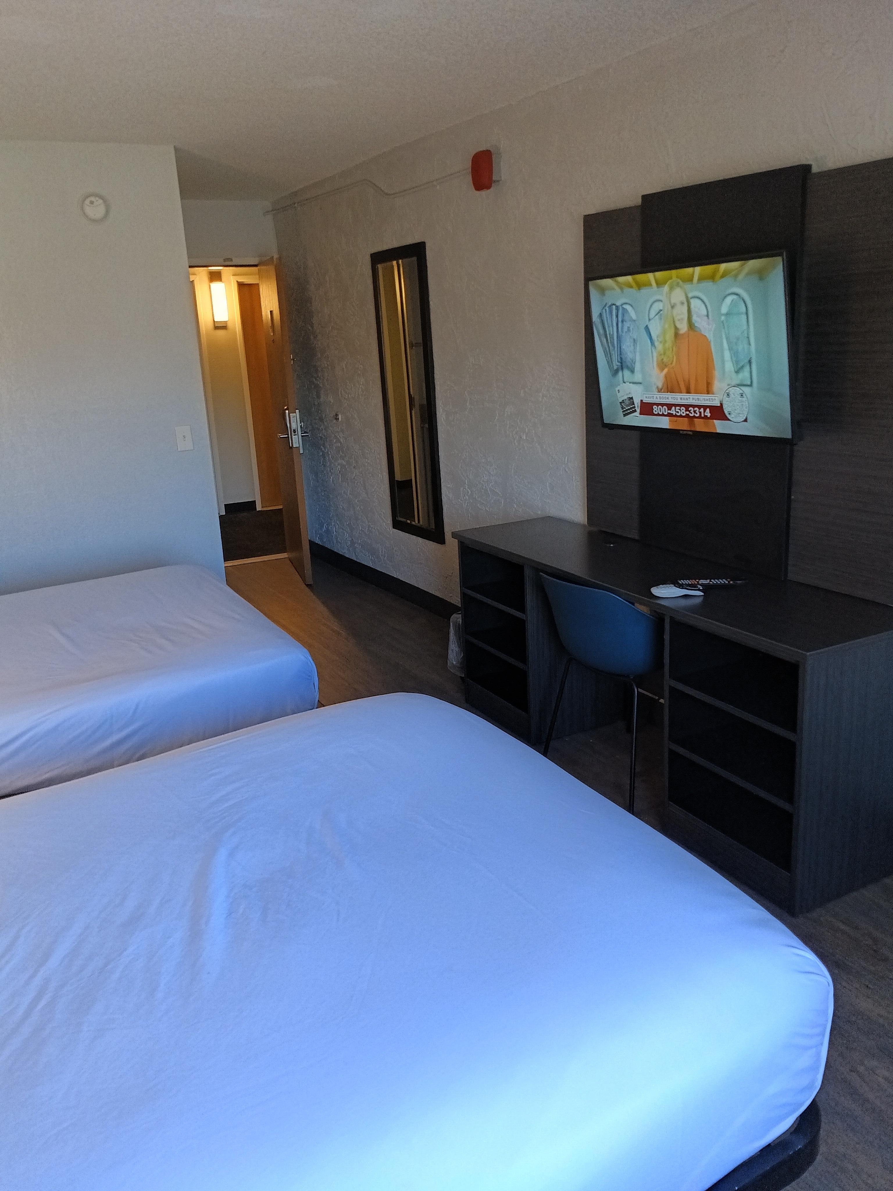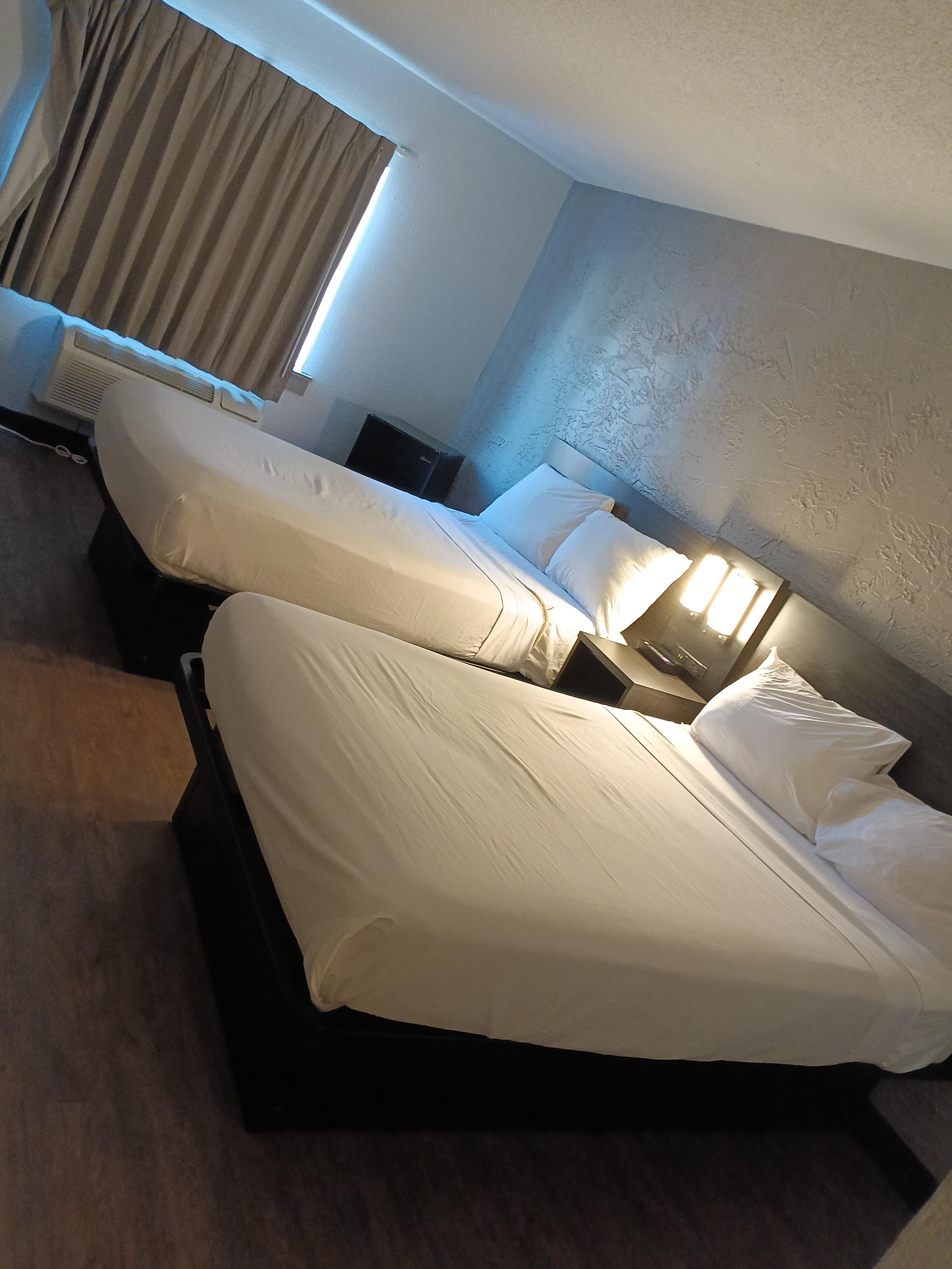 Booked a room with a queen size bed, got in to our first room and it was dirty. The floor was not swept. Toilet seat was dirty. Table and chair had crumbs on them. Went to the front desk to change our room. Got keys to a different room and was given a room with a twin size bed. It was still dirty, one of the side bed tables was missing, the plug cover to where the tv was plugged in was missing so there were cables sticking out. Don’t recommend, almost decided to just take the loss and make the 2 hr drive back home after my event that ended at midnight.