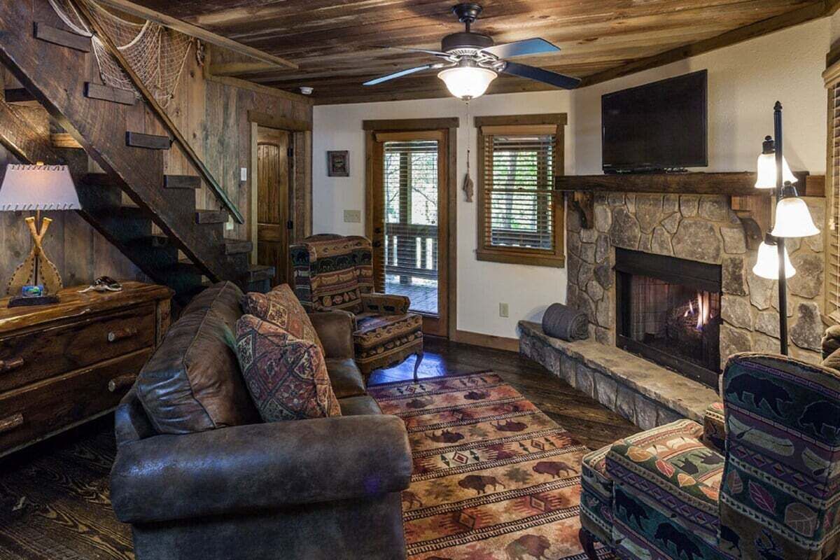 Amenities that appeal to couples at this riverfront cabin include a fireplace, a kitchen, and a smart TV.