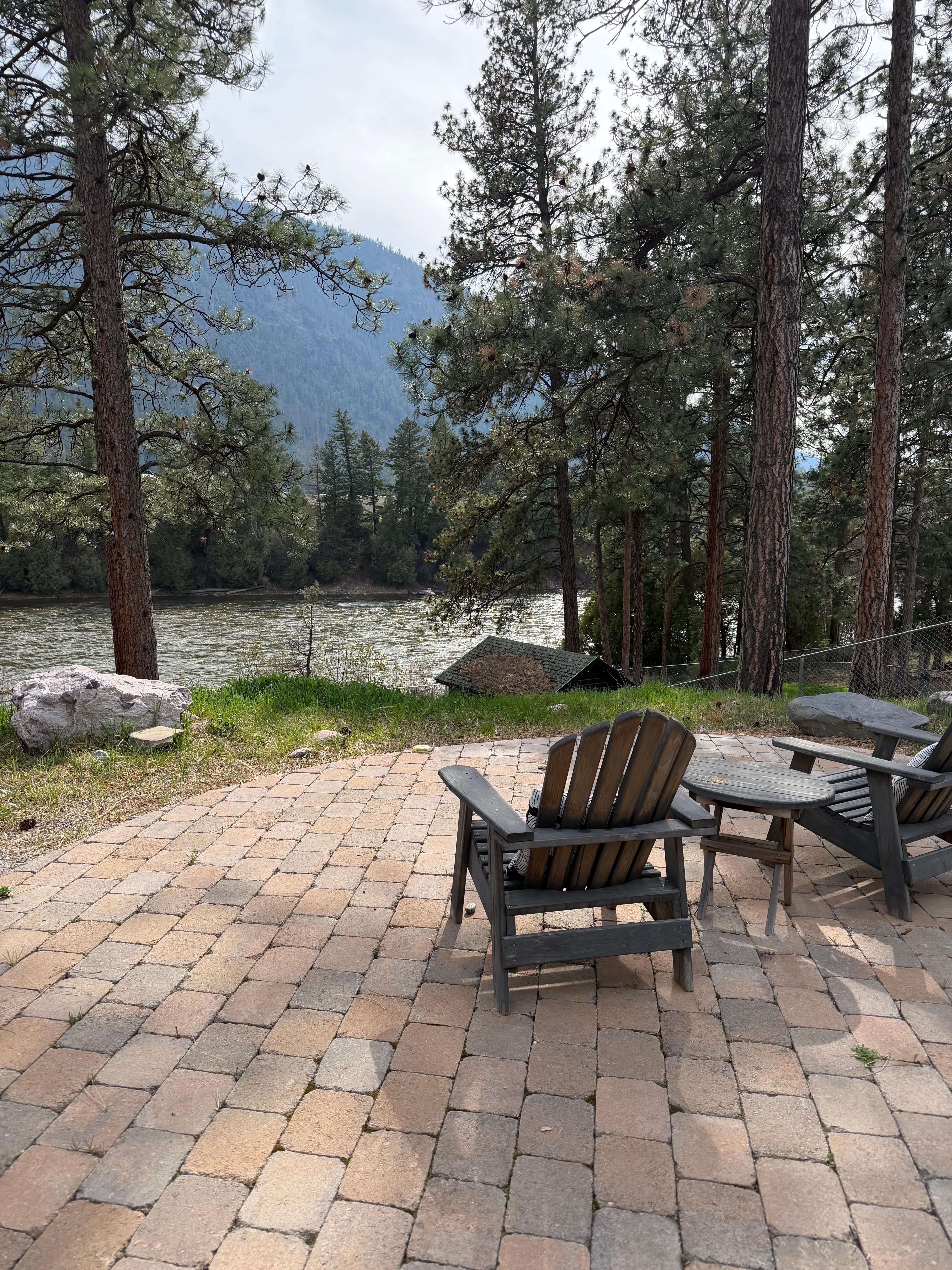 Steps, hill near patio, river is not fenced off