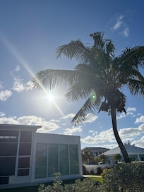 No, there aren't any villas with balconies at Beach Villa Steps from the Beach Luxury Stay Private Pool 2 miles from airport.