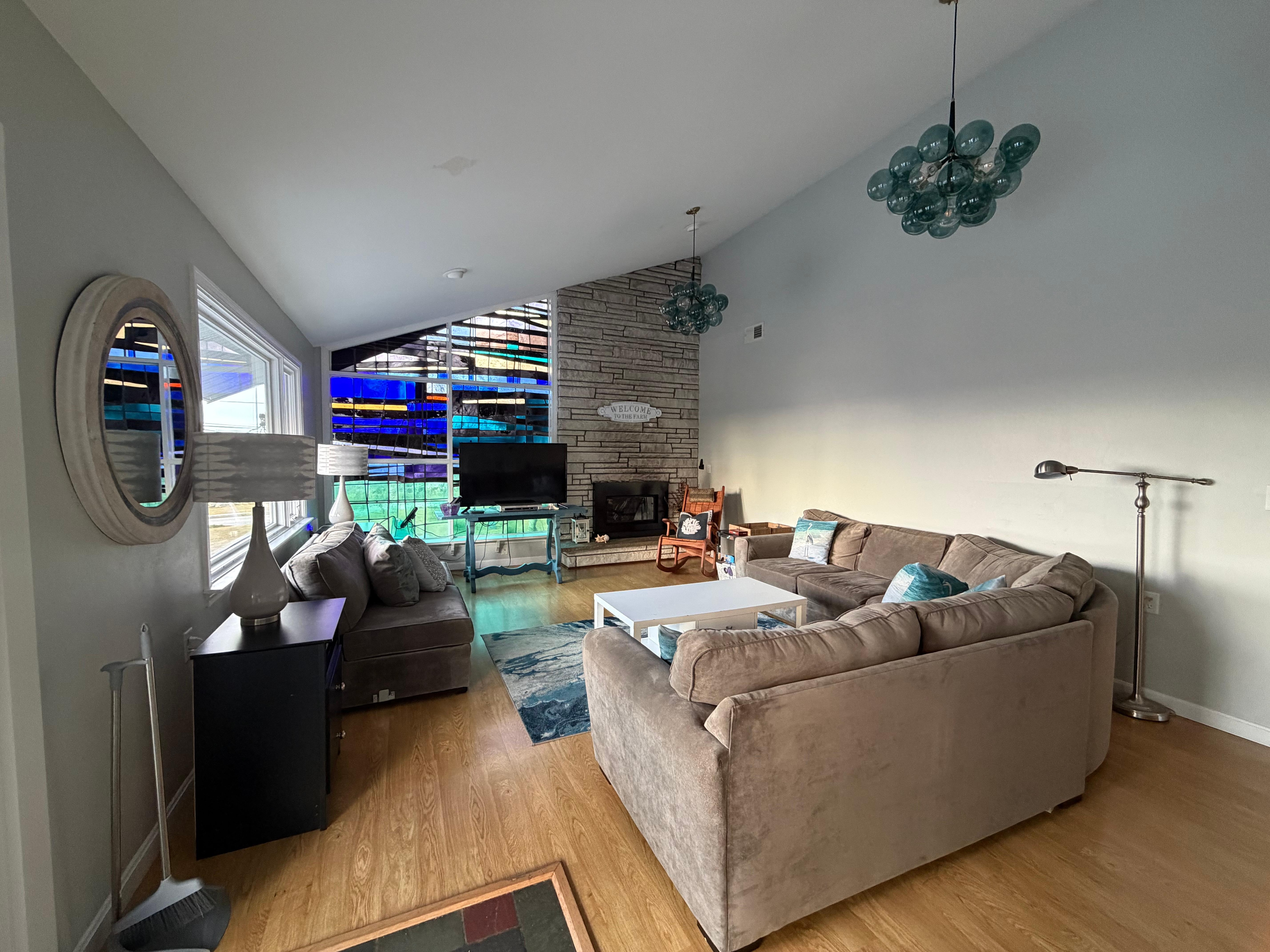Step inside your next gorgeous retreat, and you'll find a stylish and spacious interior. High ceilings grace the upstairs living room, where a cozy fireplace and comfortable sofas create a warm and welcoming atmosphere for you and your loved ones to embrace. The unique stained-glass windows add a touch of character and charm, casting colorful patterns across the room. Your culinary adventures await in the well-equipped kitchen with dark cabinets and modern appliances, while the dining areas offer both an intimate kitchen table and a more formal space with natural light pouring in from all directions - for your comfort the central air conditioning provides the perfect temperature throughout your whole stay.