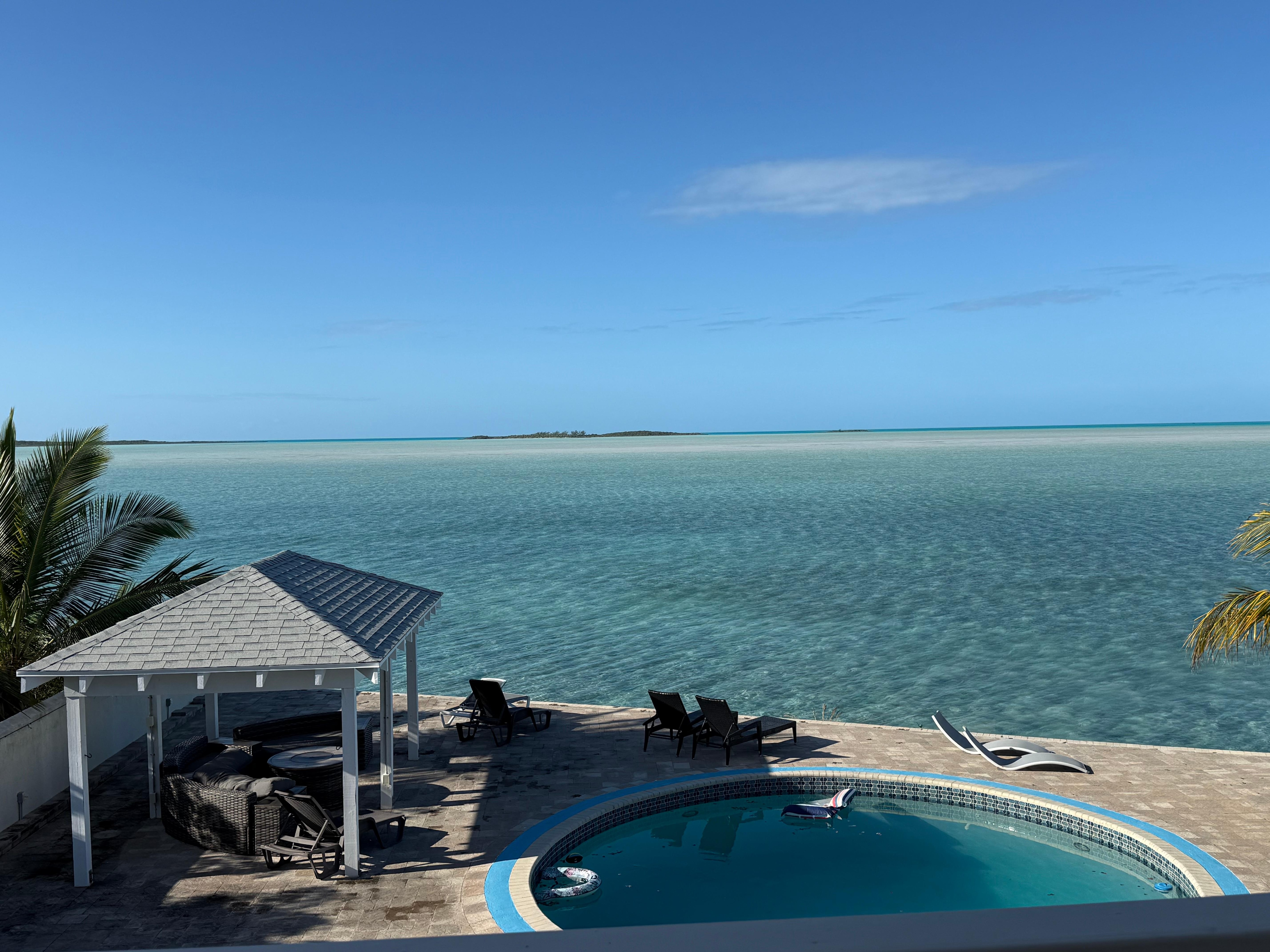 This was located in a quiet remote location with amazing views from the sand bars to the brilliant bright stars and amazing sunsets. It had everything we needed, kayaks, floats, coolers, kitchen appliances, beach gear etc. We enjoyed snorkeling off the deck, kayaking to the remote island, and the pool. Communication with the owner and property manager fantastic! Can’t wait to go again! It was off a gravel road so the jeep was the way to go! We even had food delivered by Dena’s donuts. Exuma is amazing and we didn’t miss not having a beach as we could enjoy the chairs on the patio and easy access to shallow water which extended all the way for 11/2 miles to mesquito cage.