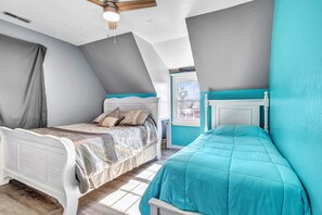 UPSTAIRS BEDROOMS & BATHROOMS: -Bedroom A: Master bedroom suite with king bed, walk-in closets, crib, private bath, and private TV. -Bedroom B: Full size bed, bunk bed with full-size mattresses, walk-in closet with laundry facilities. -Bedroom C: Queen and twin bed. -Bedroom D: Queen and bunk bed with twin mattresses, and small desk. -Bathroom: (Shared for rooms B, C, and D) Double sinks and a mirror. Toilet and shower are separated by a door. -Extra bedding, playpen, and twin-size cots are available for your use at no extra charge!