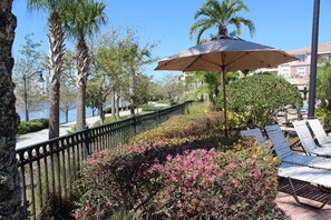 Lakefront apartment with a fitness center and an outdoor pool