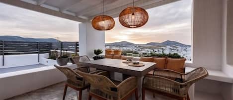 The outdoor area of Deluxe Suite boasts a charming shaded veranda, complete with a cozy sitting area and a dining table, perfect for savoring meals while admiring breathtaking views of the garden, the pool, and the Aegean Sea. Guests also enjoy access to a shared pool, part of the exclusive complex.