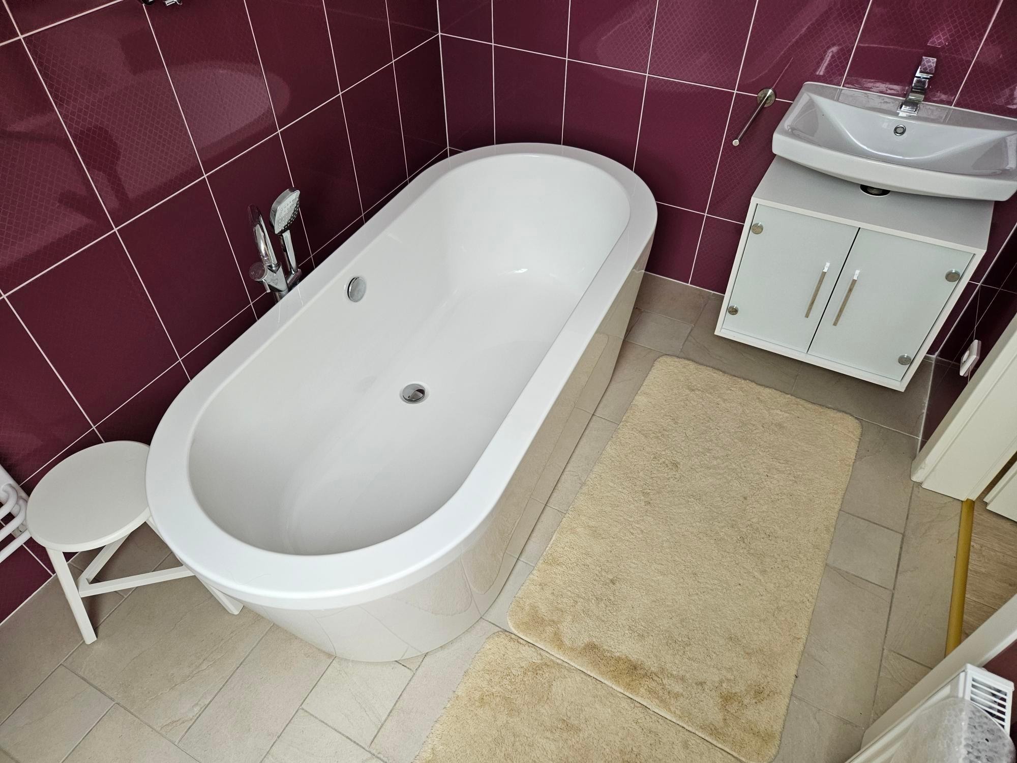 The modern bathroom has a vanity, toilet, free-standing bathtub incl. Towels.