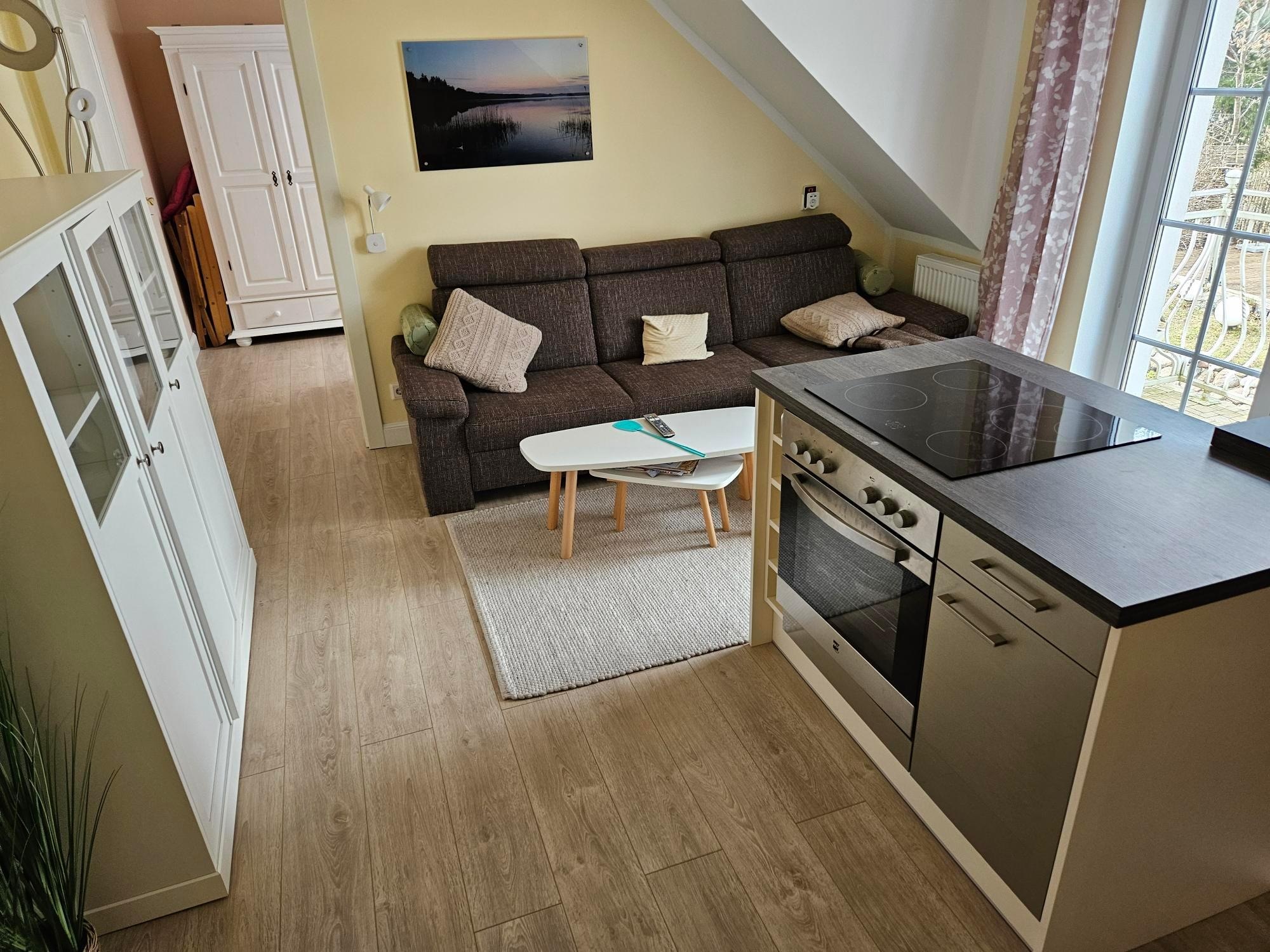 The kitchen is in the open apartment-living area with a sofa bed for one person