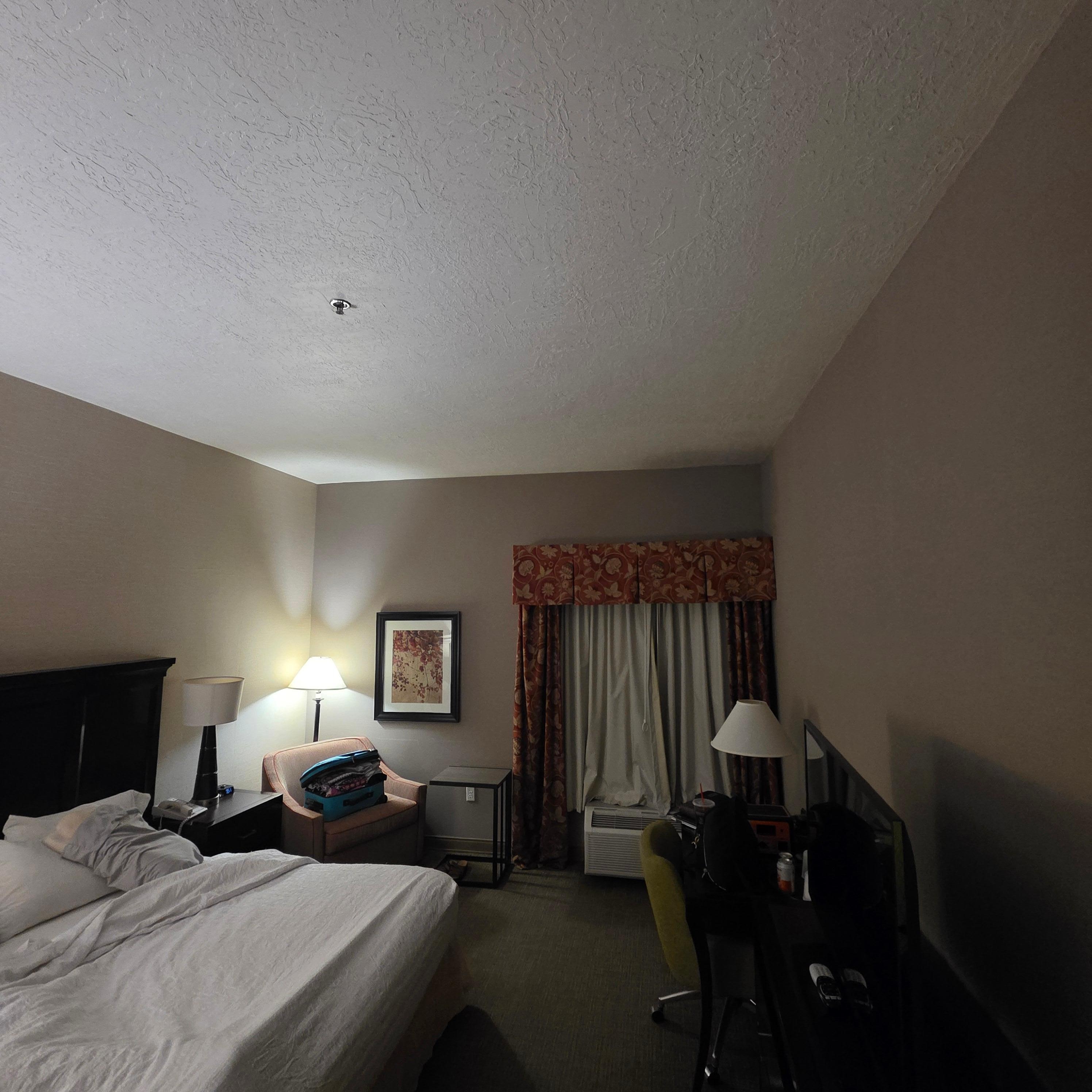 Clean room and comfortable bed, but the temperature of the water in the shower fluctuated greatly during a shower and sometimes came out hot enough to burn skin, so caution was used at all times. This is a handicap room! Not sure how someone in a wheelchair could ever reach the shower head wand? Because if you don't actually hold the wand, the water goes everywhere and over your head? Plus for handicap rooms, the lines beneath the sink are not wrapped for protection. The temp of the water could get them sued if a child gets scaulded from it. We told them at the front desk, but not sure if they have fixed that. Hope they did!