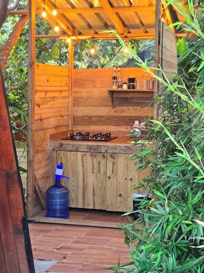 Guests staying at this cabin have access to local meal delivery service, a garden, and a water dispenser.