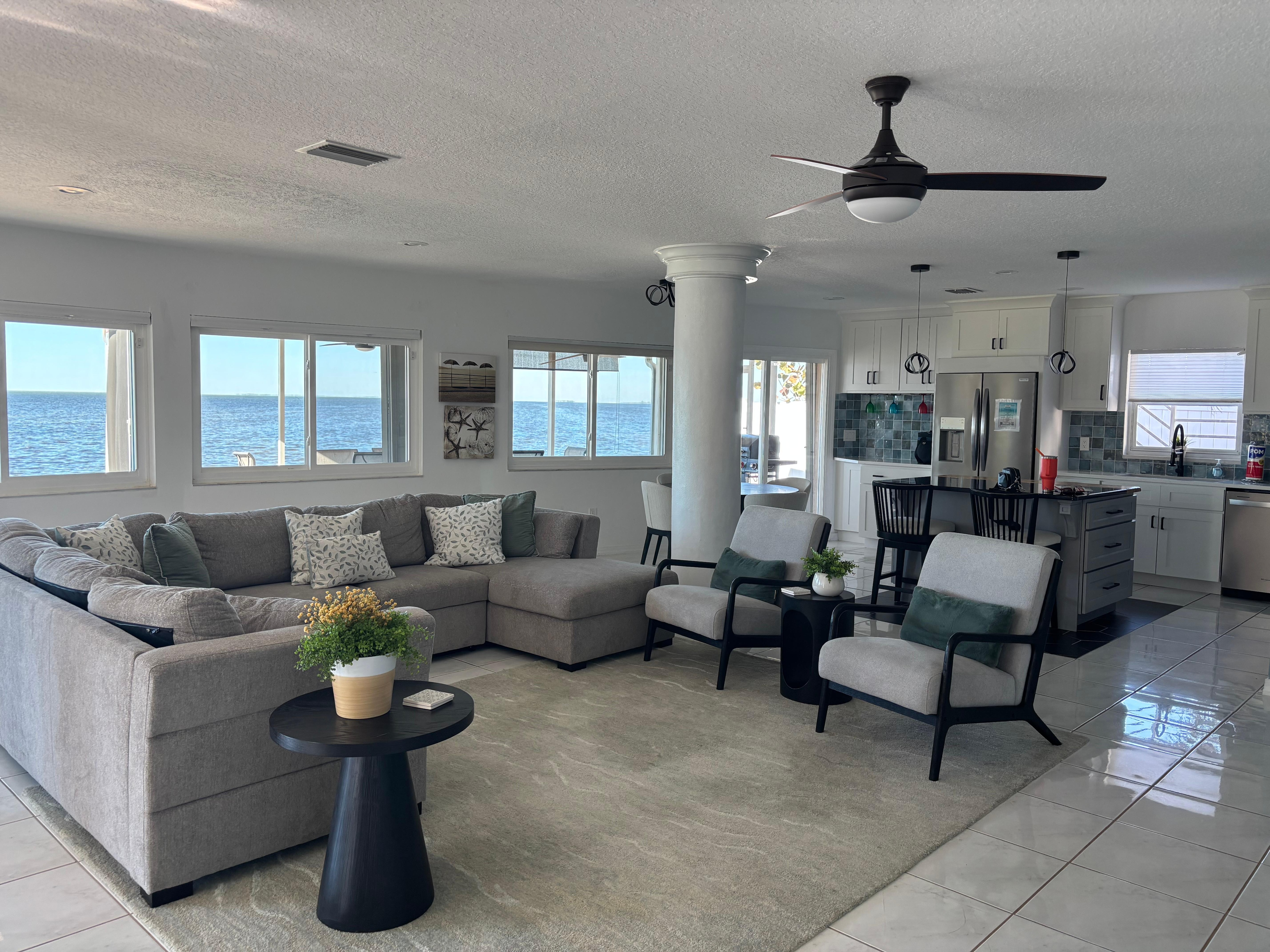 The living room is perfect for entertaining friends and family. The open design includes an adjoining dining area. The large windows allow for beautiful water views and colorful sunsets. The home’s open living/dining room area overlooks the water.