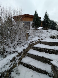 Delante de la puerta hay una terraza que te invita a detenerte. Con una vista perfecta del valle y la puesta del sol, aquí tienes horas libres de estrés.