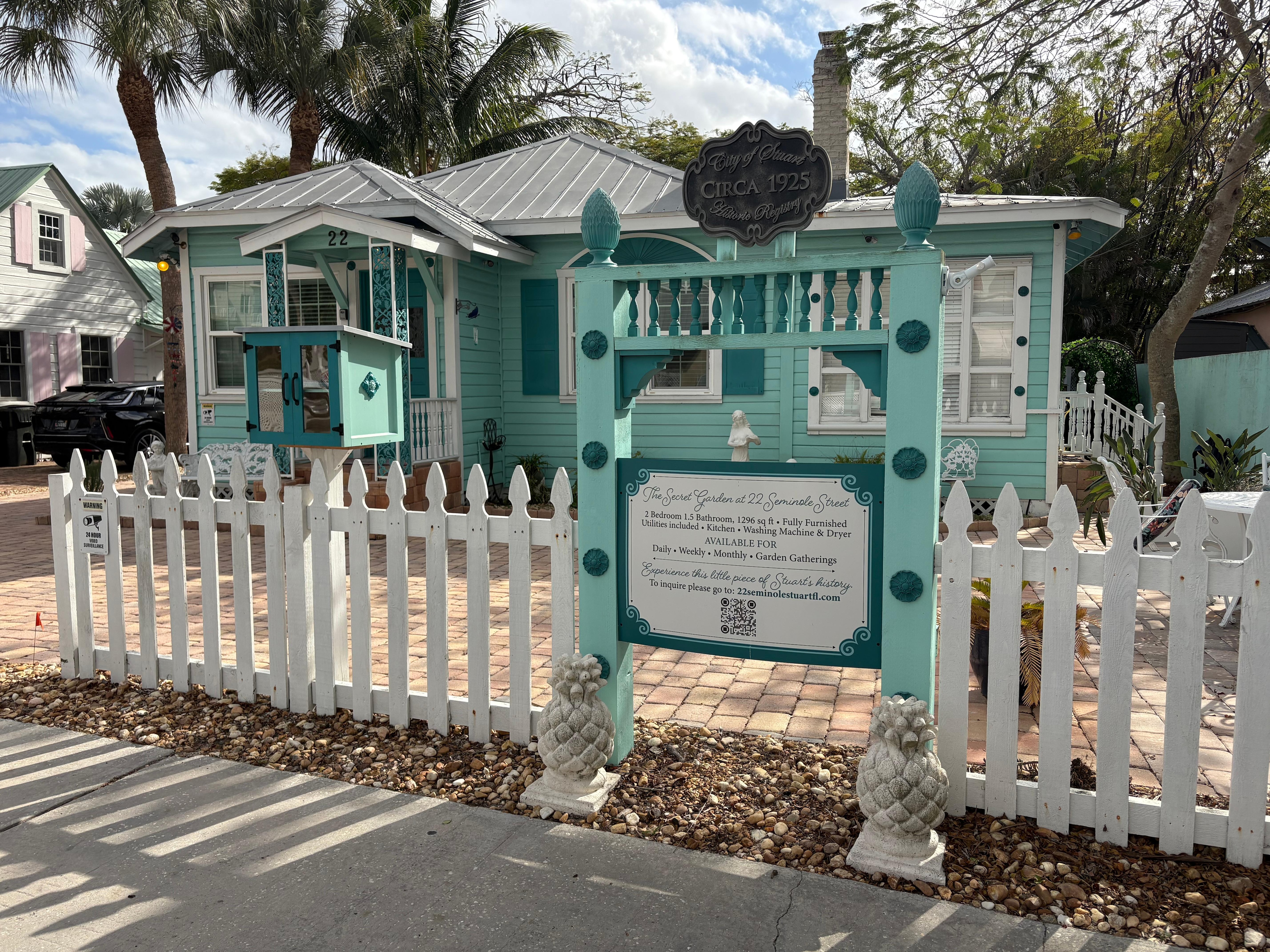 Welcome to the Secret Garden at Seminole Street nestled in the heart of downtown Stuart. We invite you to experience this little piece of Stuart, Florida’s history. Located within walking distance to many of Stuarts vibrant shops, restaurants & waterfront board walks. Take a quick scenic drive to Stuarts beaches or famous local attractions.