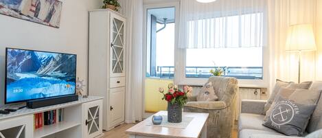 The cozy living room, with balcony, real wood flooring, solid wood furniture, large 43" Smart TV, Grundig compact system with radio, W'Lan, CD player and Bluetooth, dining table with chairs for 4 people and a high-quality sofa bed (with...