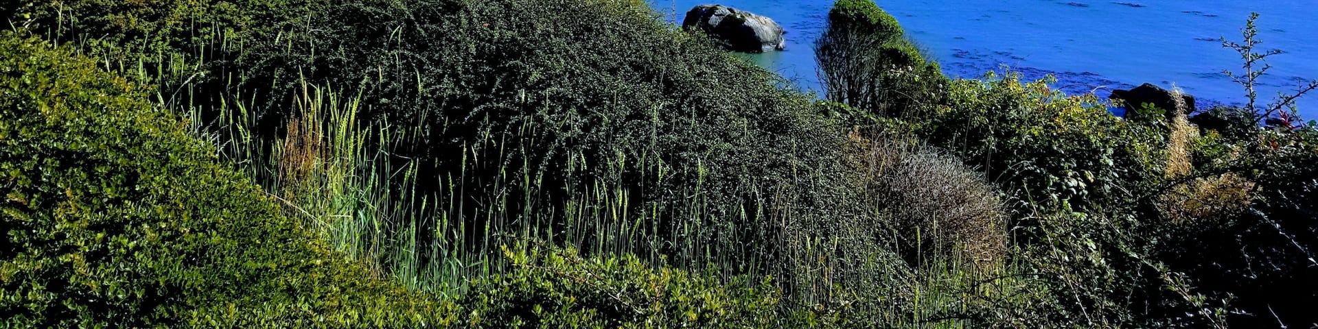 Comfy oceanside retreat, forested creekside setting, expansive grounds over ocean bluffs